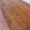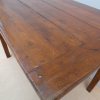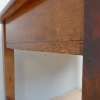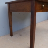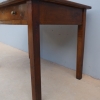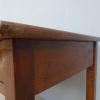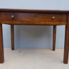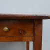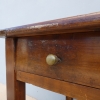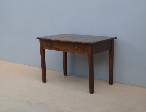 Tavolo fisso rettangolare dotato di un cassetto frontale, realizzato in legni massello misti (abete, ciliegio, noce, pioppo), appartenente d’epoca alla fine dell’800. L’essenziale figura conferisce una sobria eleganza. La ricerca di un decoro mirato si riflette anche sulla scelta dei montanti, privi di elementi decorativi. Necessita d’interventi di restauro; sono presenti fori di tarlo.