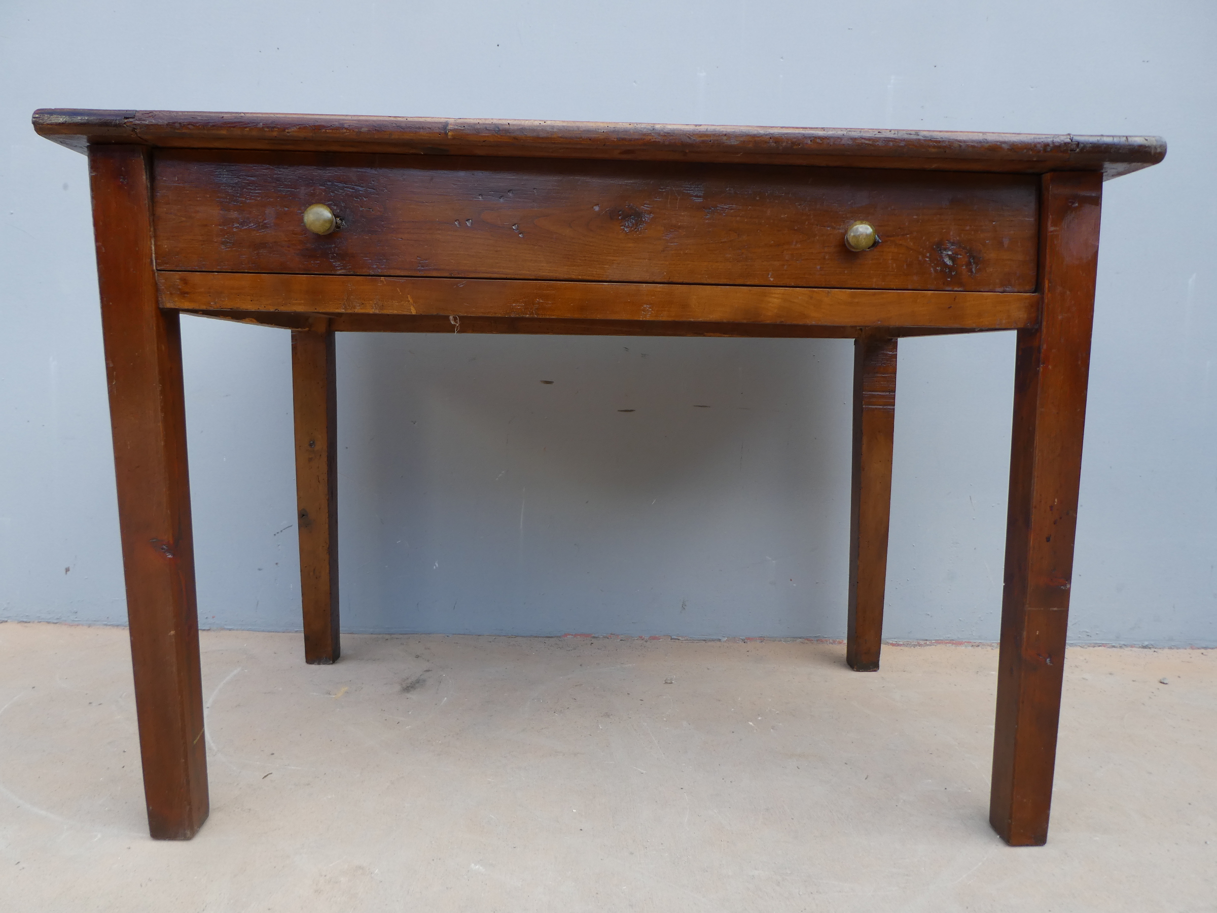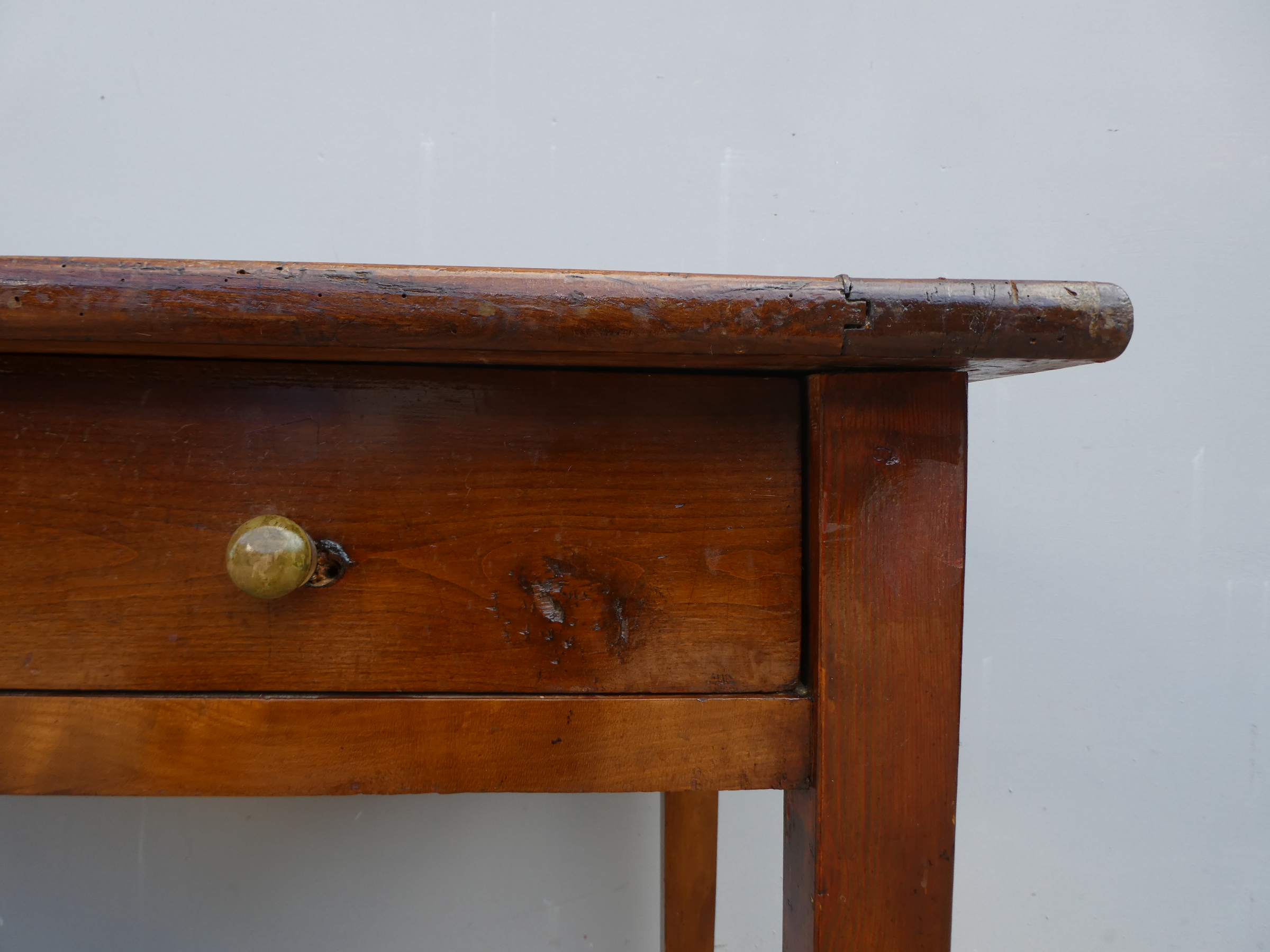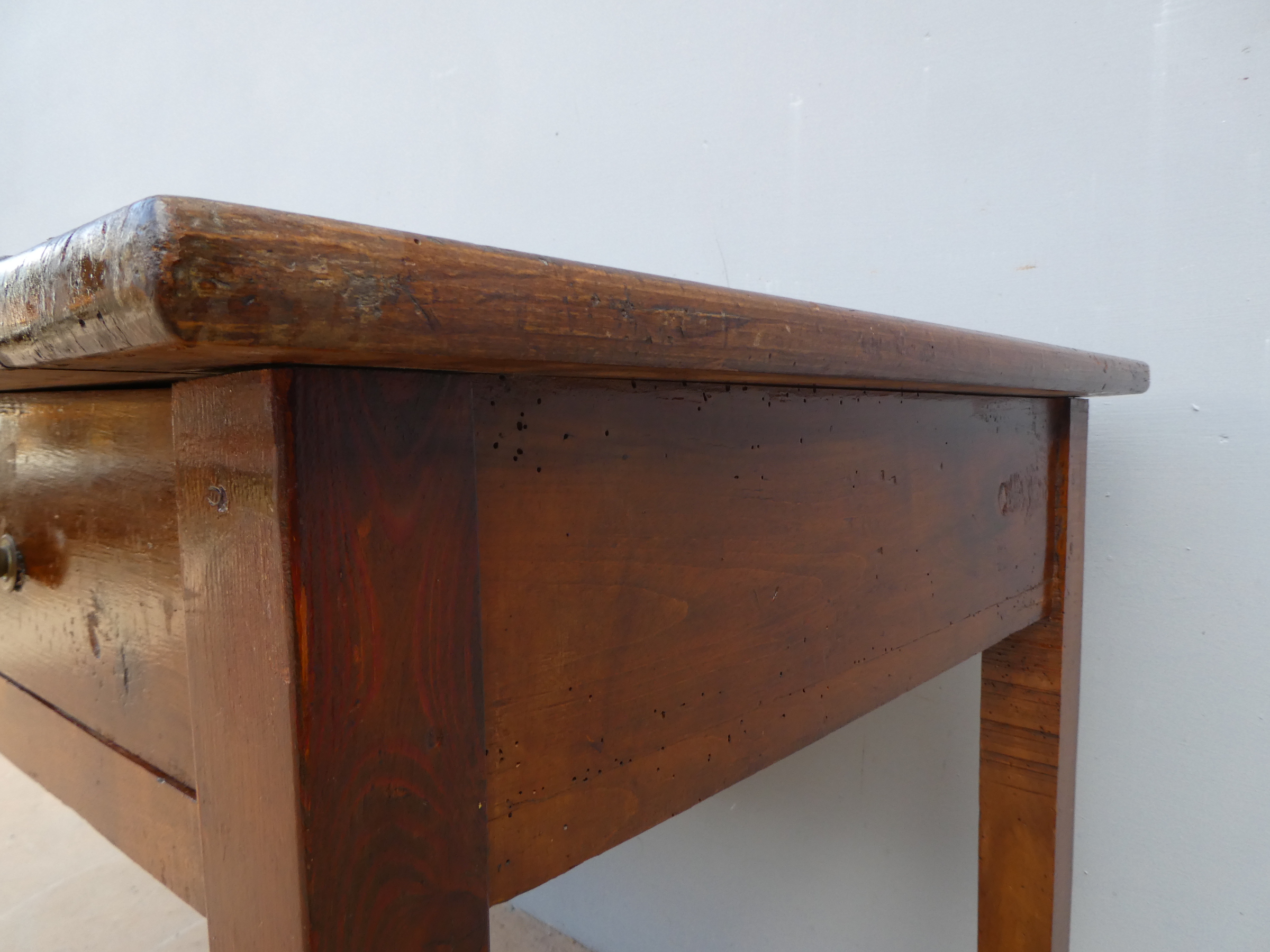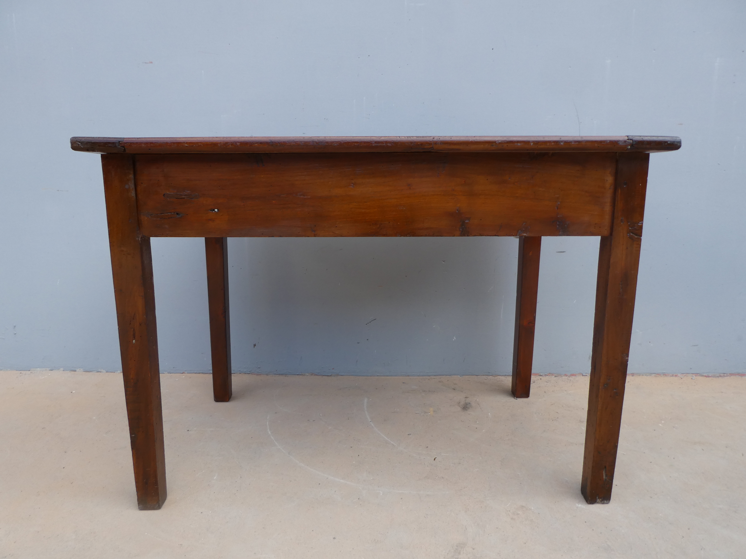 Tavolo fisso rettangolare dotato di un cassetto frontale, realizzato in legni massello misti (abete, ciliegio, noce, pioppo), appartenente d’epoca alla fine dell’800. L’essenziale figura conferisce una sobria eleganza. La ricerca di un decoro mirato si riflette anche sulla scelta dei montanti, privi di elementi decorativi. Necessita d’interventi di restauro; sono presenti fori di tarlo.