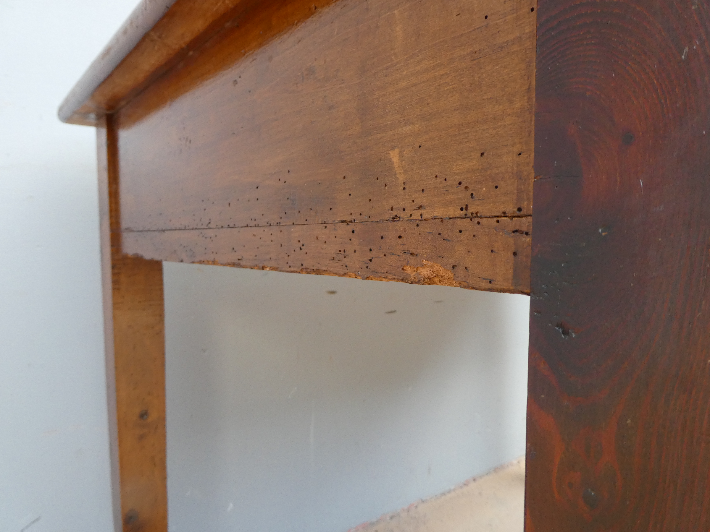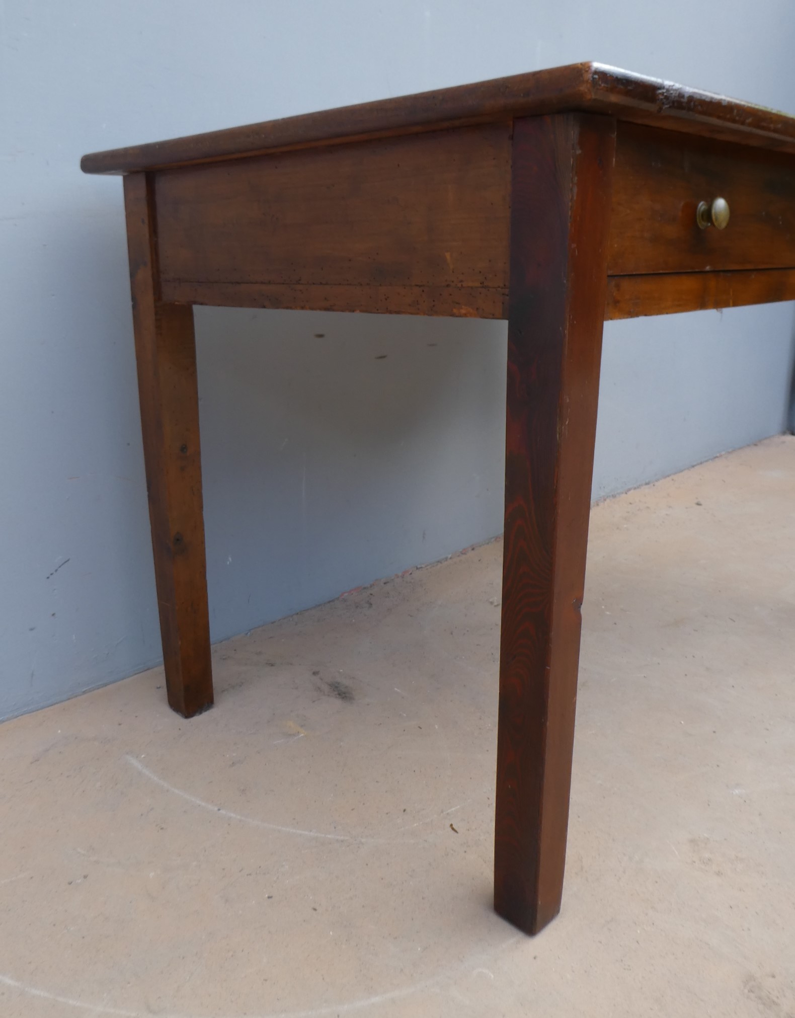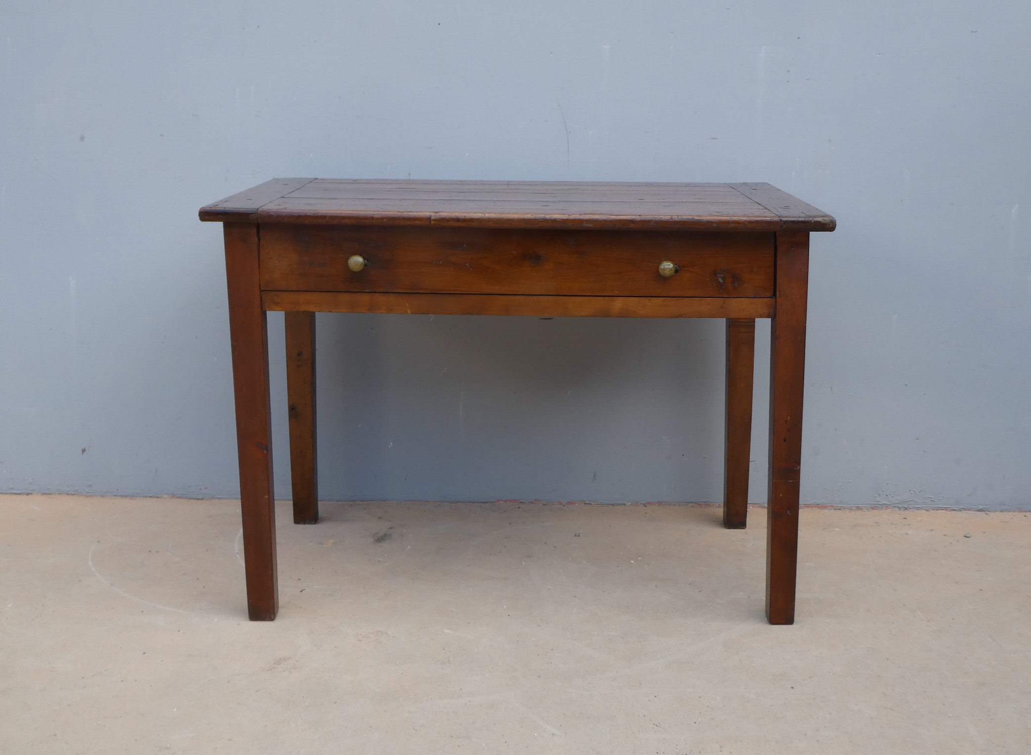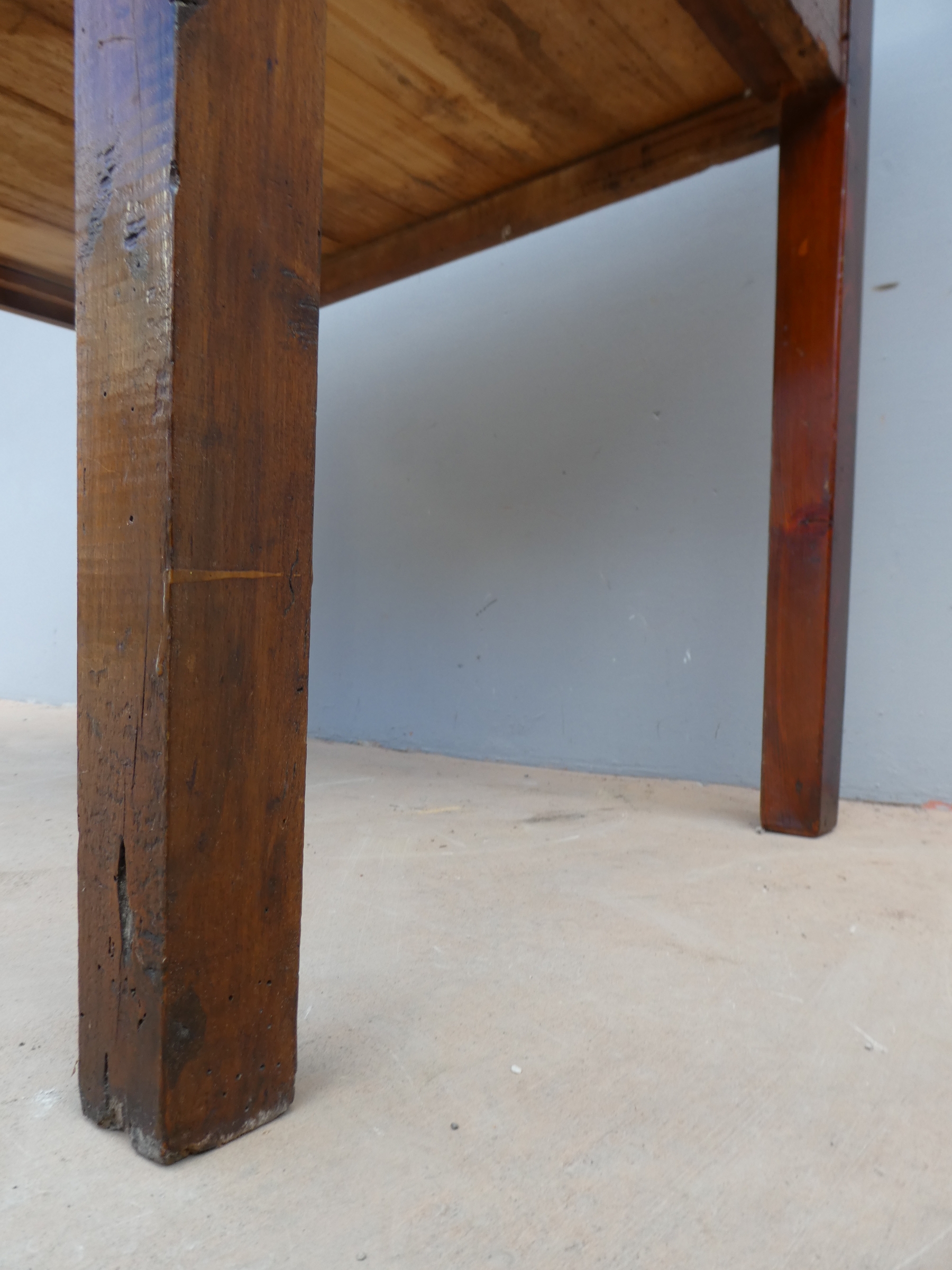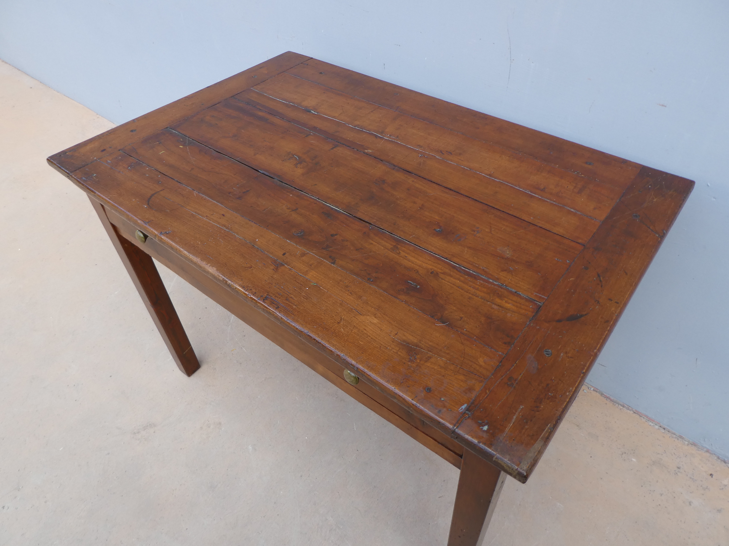 Tavolo fisso rettangolare dotato di un cassetto frontale, realizzato in legni massello misti (abete, ciliegio, noce, pioppo), appartenente d’epoca alla fine dell’800. L’essenziale figura conferisce una sobria eleganza. La ricerca di un decoro mirato si riflette anche sulla scelta dei montanti, privi di elementi decorativi. Necessita d’interventi di restauro; sono presenti fori di tarlo.