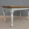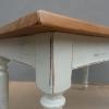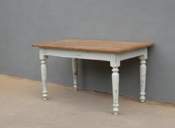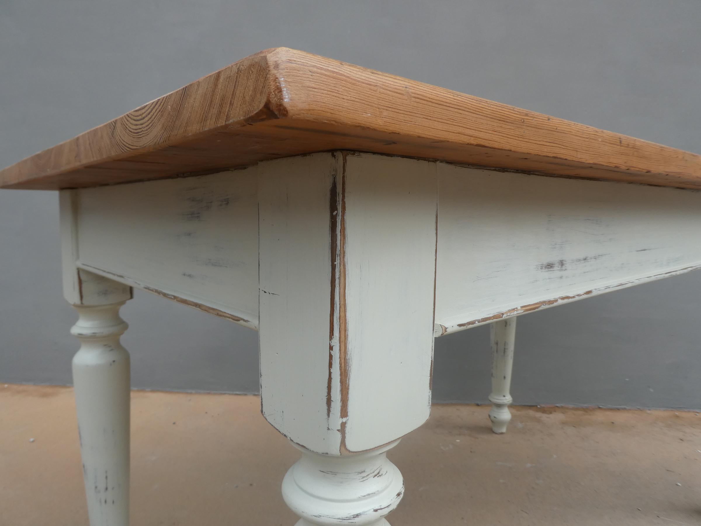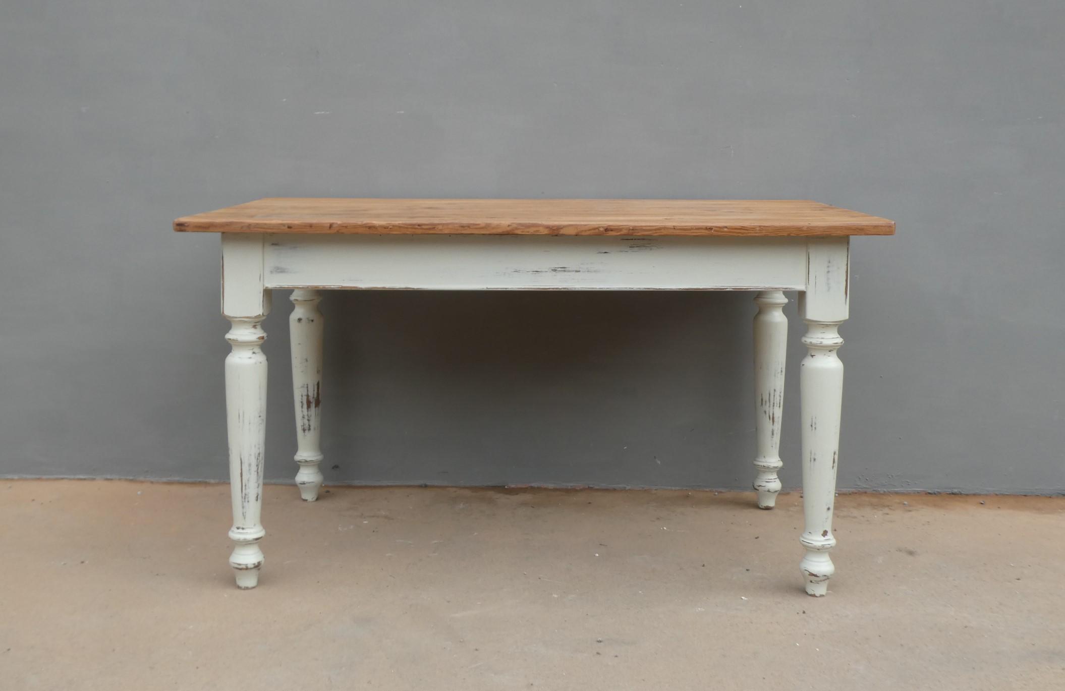 Tavolo fisso rettangolare laccato e rifinito con la tecnica “Shabby Chic”, che prevede l’uso di colori chiari in superficie e colori più scuri che affiorano dopo il trattamento d’usura. Ciò che rende originale questo mobile, è il contrasto creato dalla lacca chiara utilizzata per il cavalletto delle gambe, con quella del piano in larice (non coevo), lasciato a legno. Epoca fine ‘800.