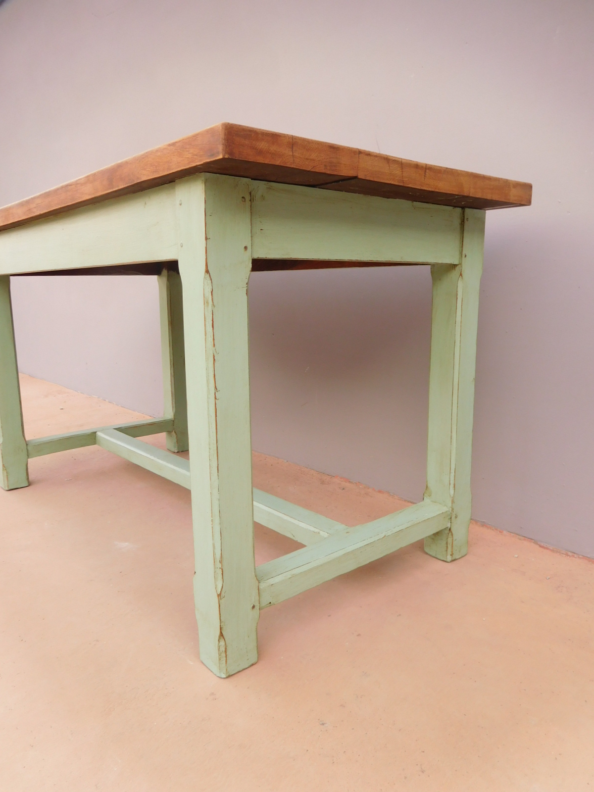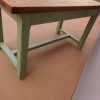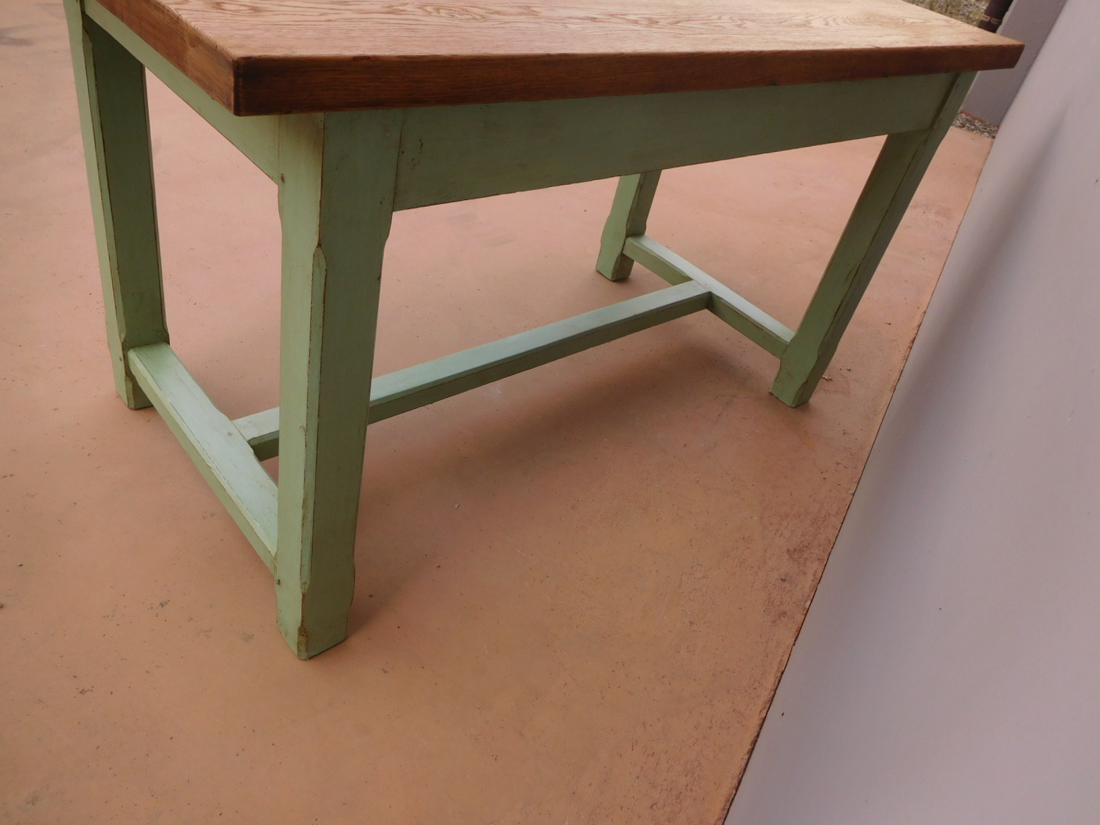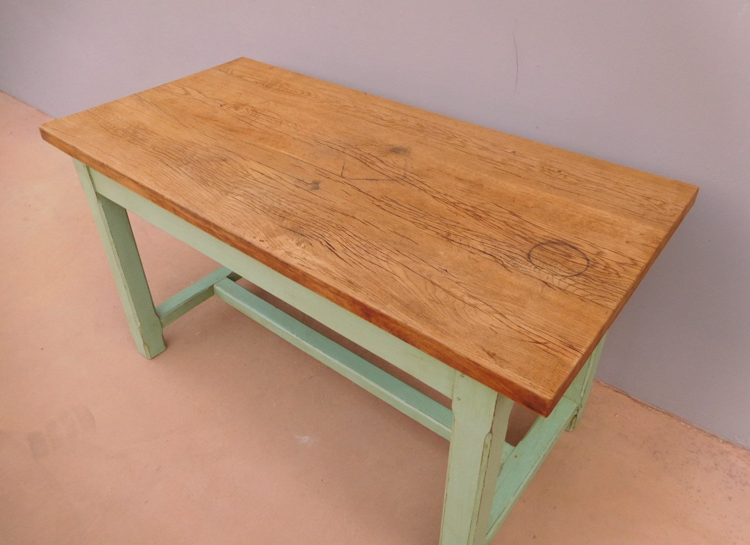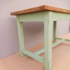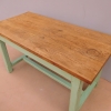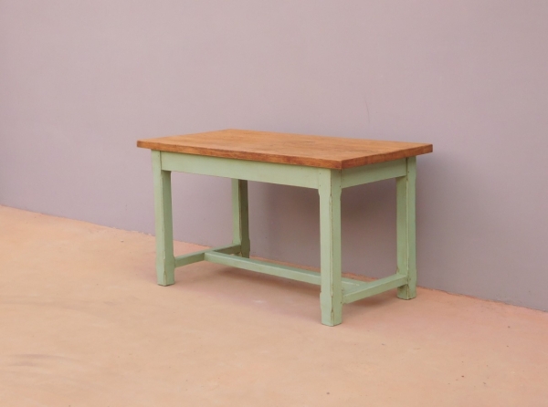 Tavolo fisso rettangolare laccato e rifinito con la tecnica “Shabby Chic” che prevede l’uso di colori chiari e colori più scuri che affiorano dopo il trattamento d’usura. Ciò che rende elegante ed originale questo mobile, è il contrasto creato dalla lacca utilizzata per il cavalletto delle gambe, con quella del piano in rovere massello, lasciato a legno. Sano di struttura. Epoca prima metà ‘900.