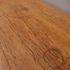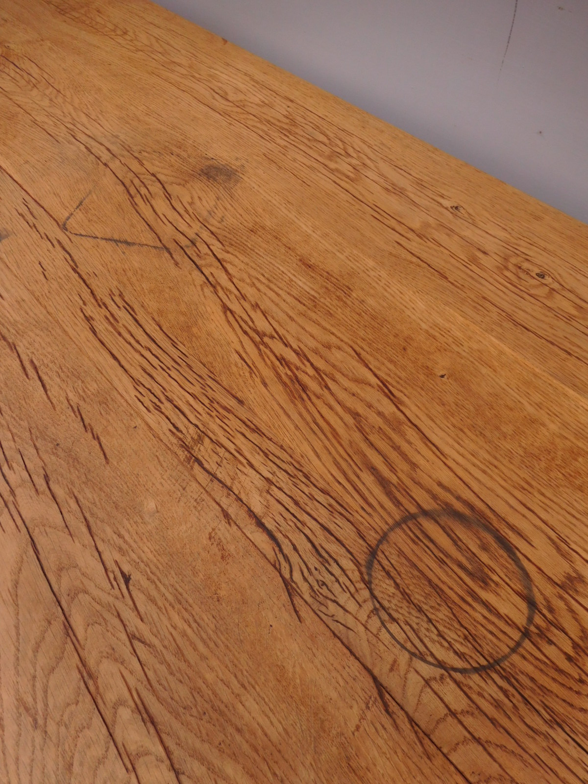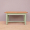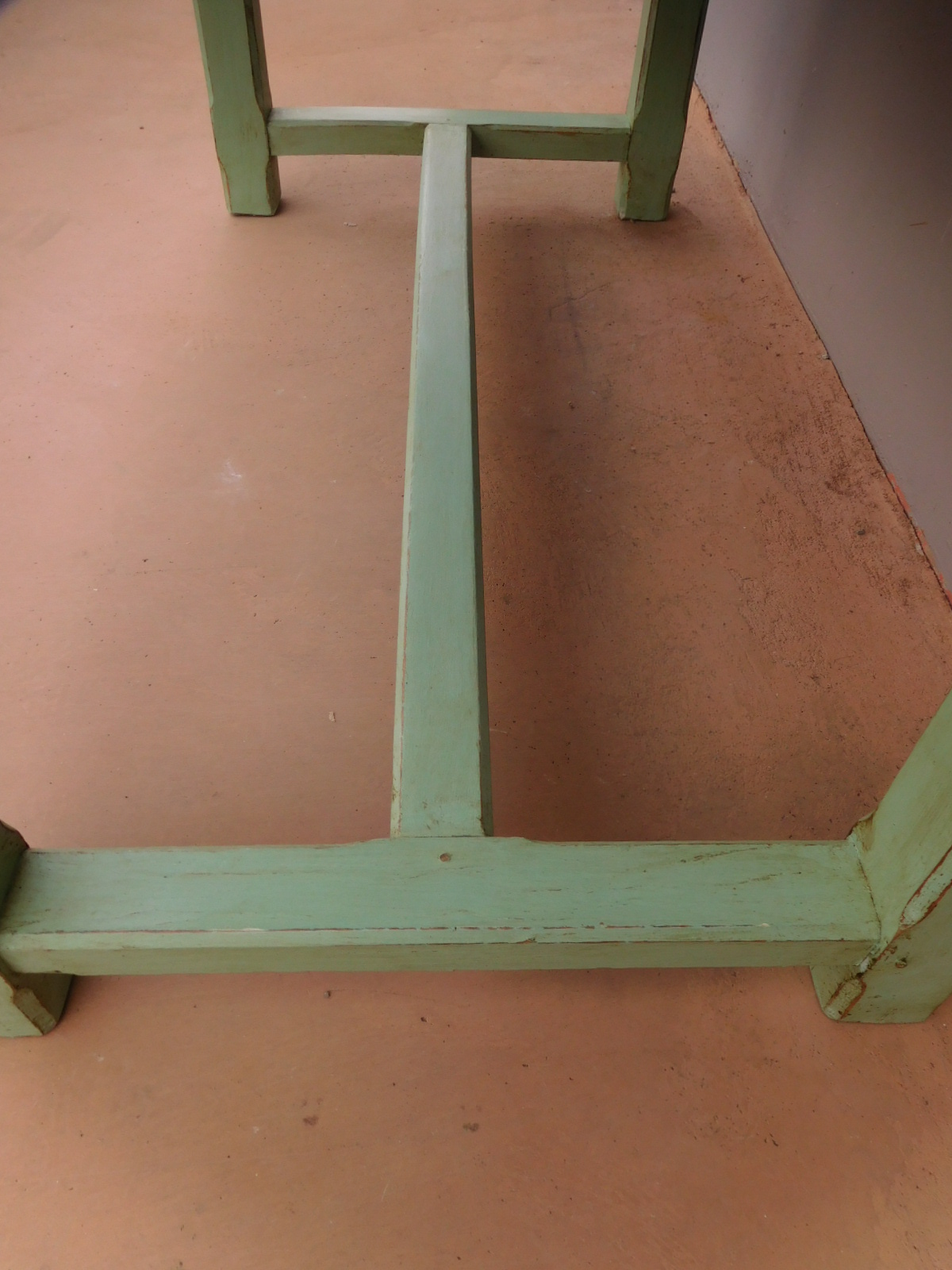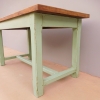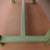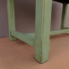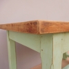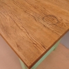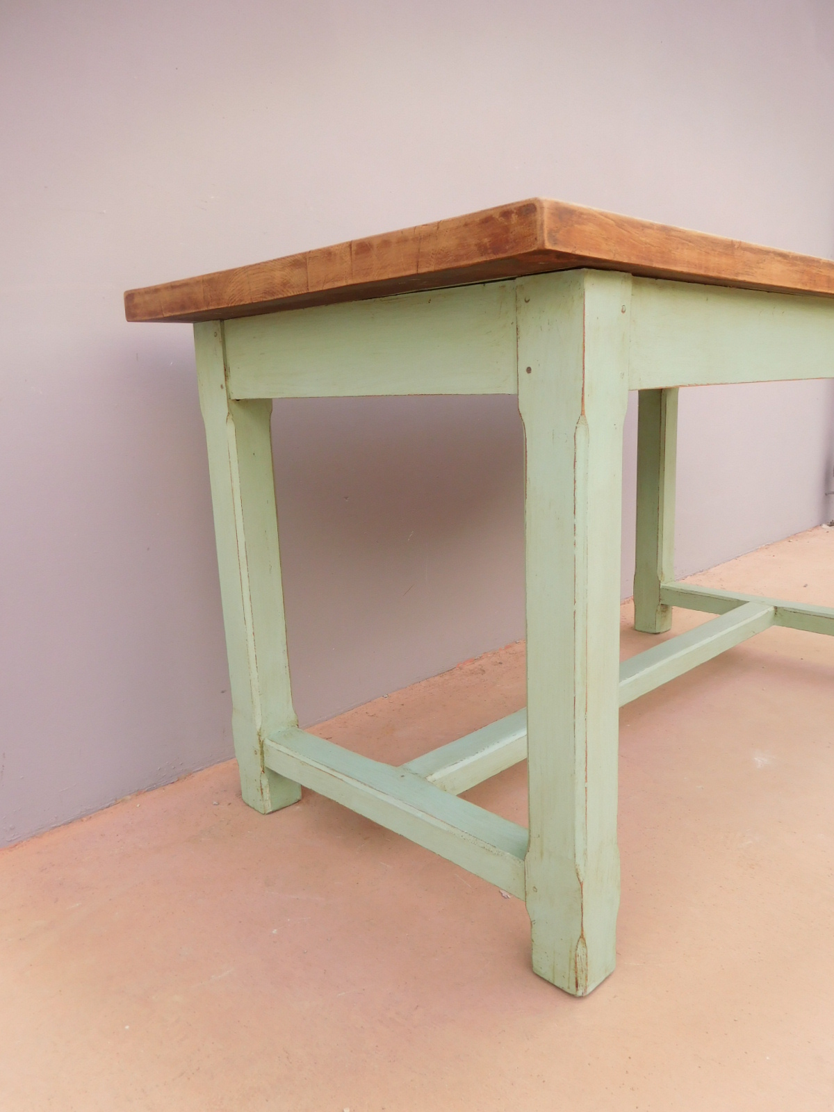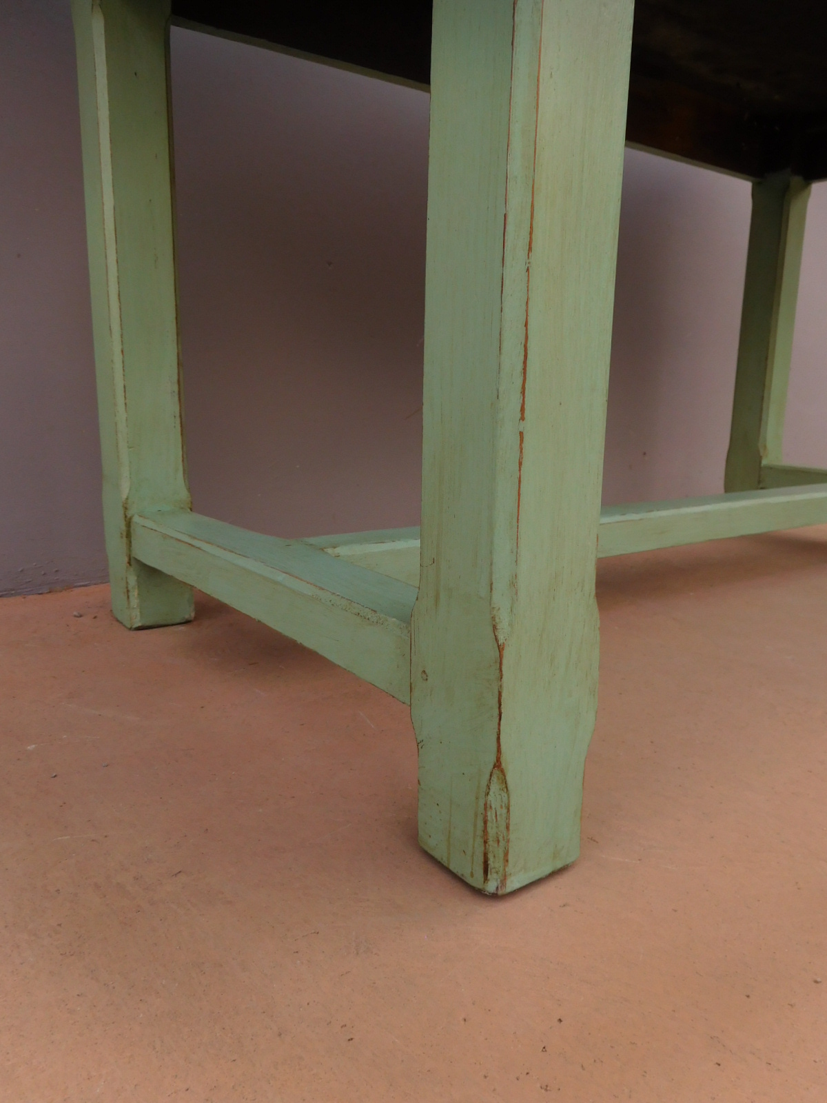Tavolo fisso rettangolare laccato e rifinito con la tecnica “Shabby Chic” che prevede l’uso di colori chiari e colori più scuri che affiorano dopo il trattamento d’usura. Ciò che rende elegante ed originale questo mobile, è il contrasto creato dalla lacca utilizzata per il cavalletto delle gambe, con quella del piano in rovere massello, lasciato a legno. Sano di struttura. Epoca prima metà ‘900.