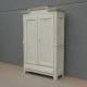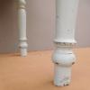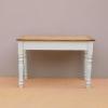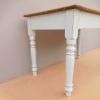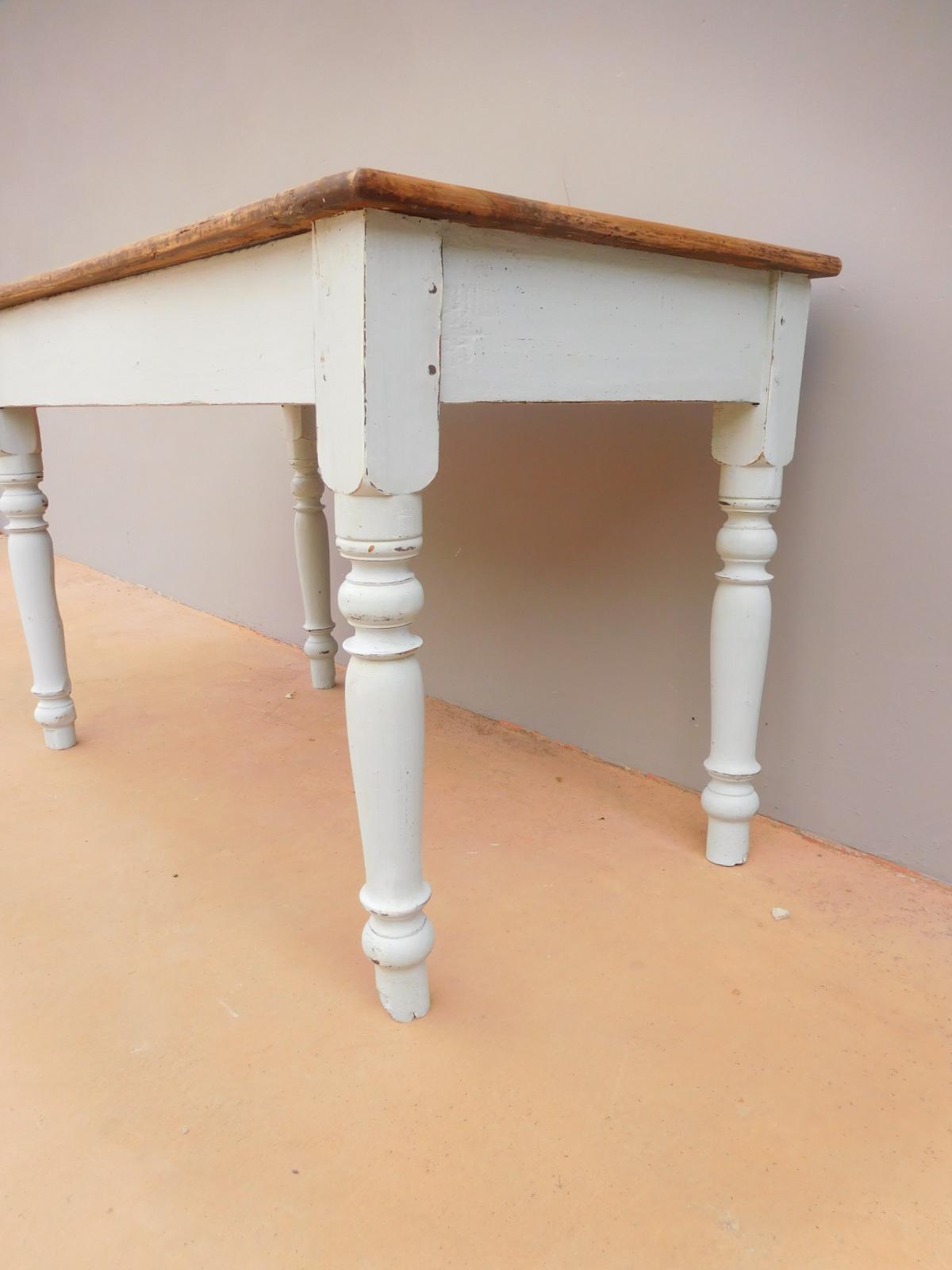 Tavolo fisso rettangolare laccato e rifinito con la tecnica “Shabby Chic” che prevede l’uso di colori chiari e colori più scuri che affiorano dopo il trattamento d’usura. Ciò che rende originale questo mobile, è il contrasto creato dalla lacca utilizzata per il cavalletto delle gambe, con quella del piano in pioppo, lasciato a legno. Sono presenti fori di tarlo; le gambe sono leggermente ‘storte’. Epoca fine ‘800/primi ‘900.