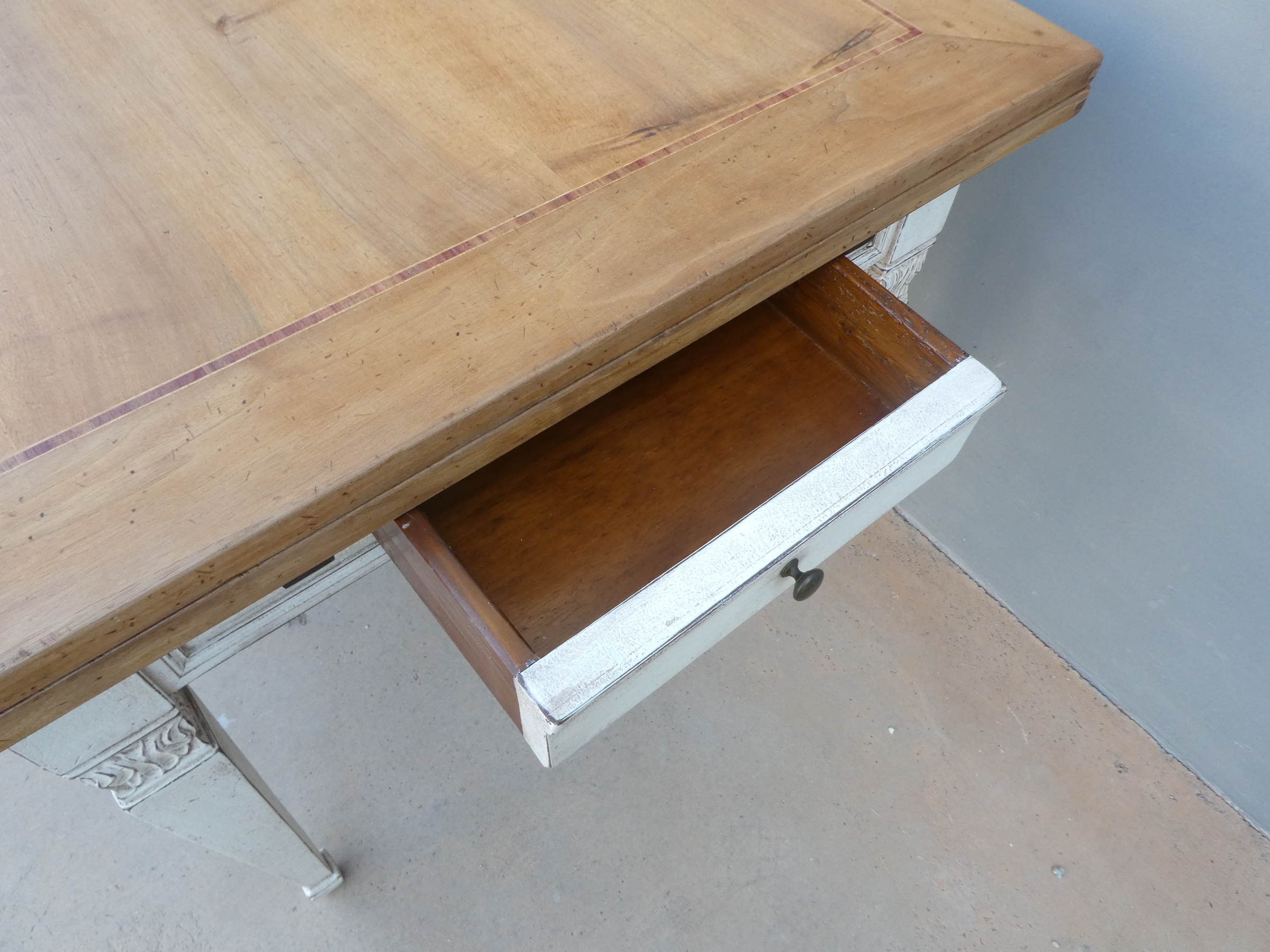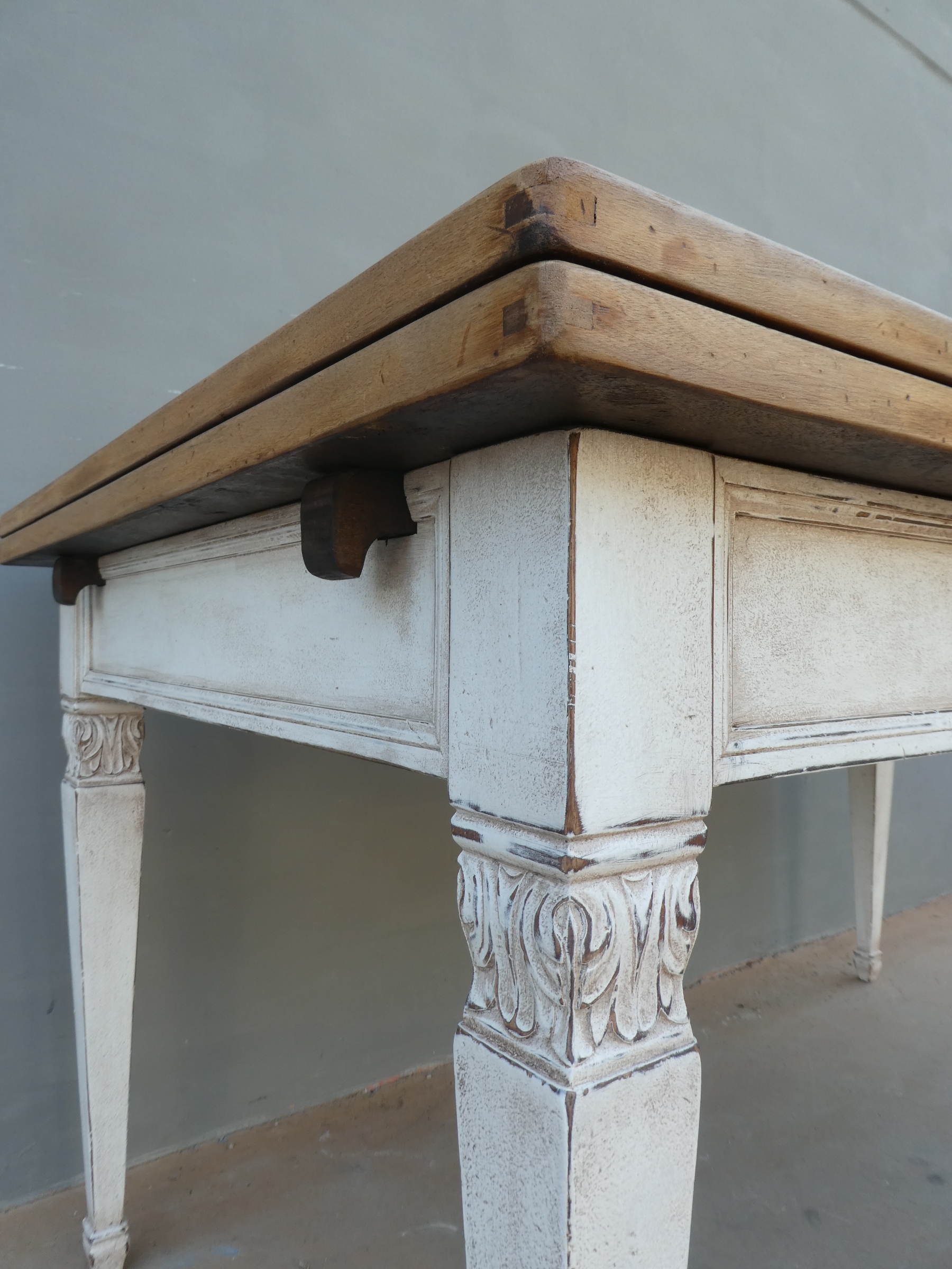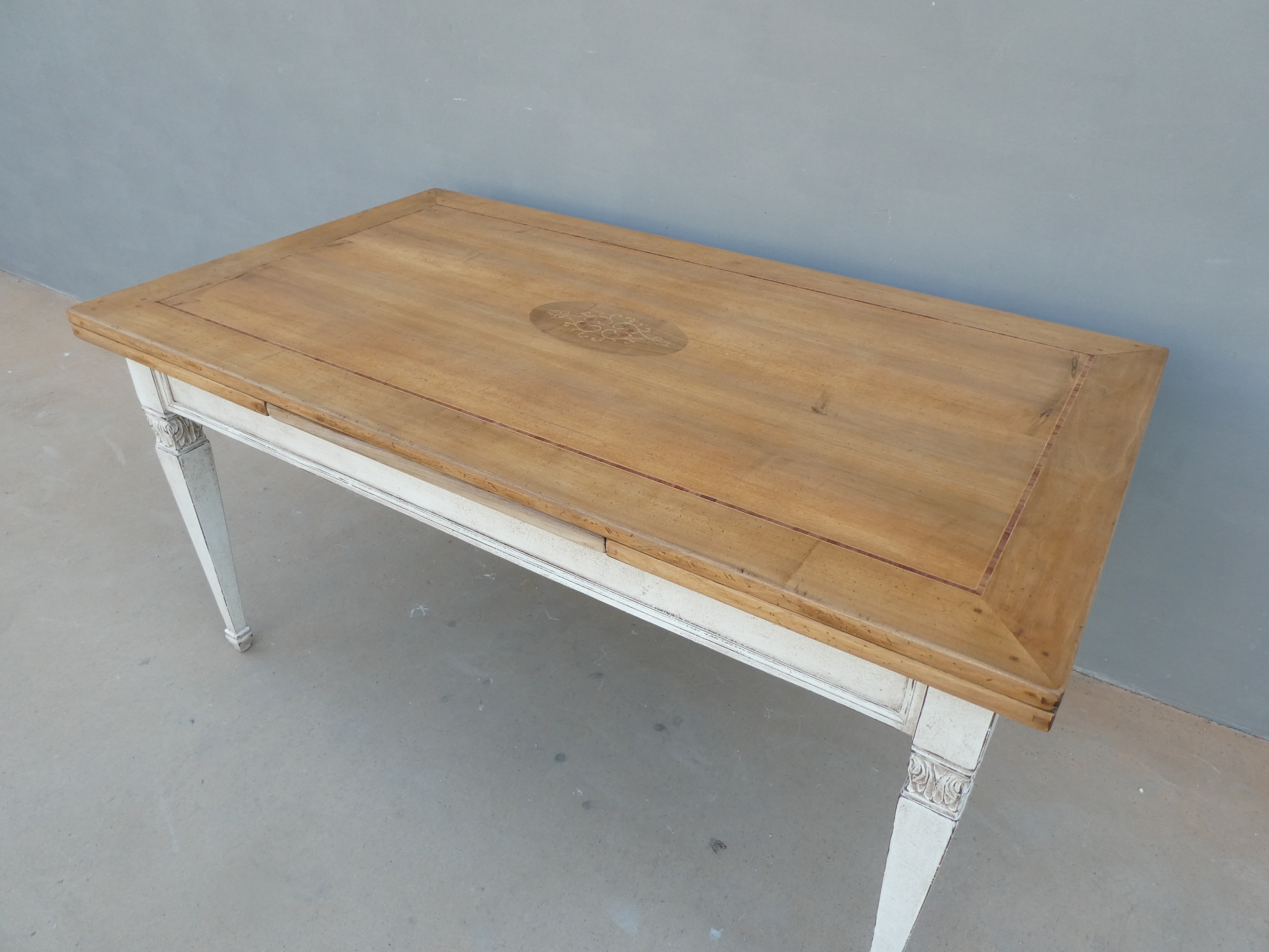 Tavolo rettangolare allungabile a tiro stile Luigi XVI dotato di cassetto laterale. Ciò che rende elegante ed originale questo mobile, è il contrasto creato dalla lacca chiara utilizzata per il cavalletto delle gambe, rifinita con la tecnica Shabby Chic, ed il piano in noce, lasciato a legno. All’occorrenza, si sfilano le allunghe laterali dal sottoplancia per aumentare la superficie d’appoggio. Epoca seconda metà ‘900.