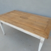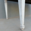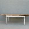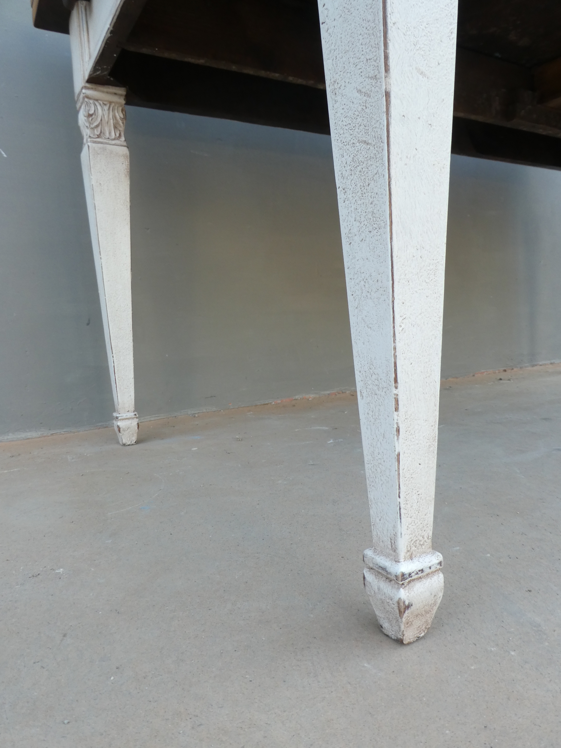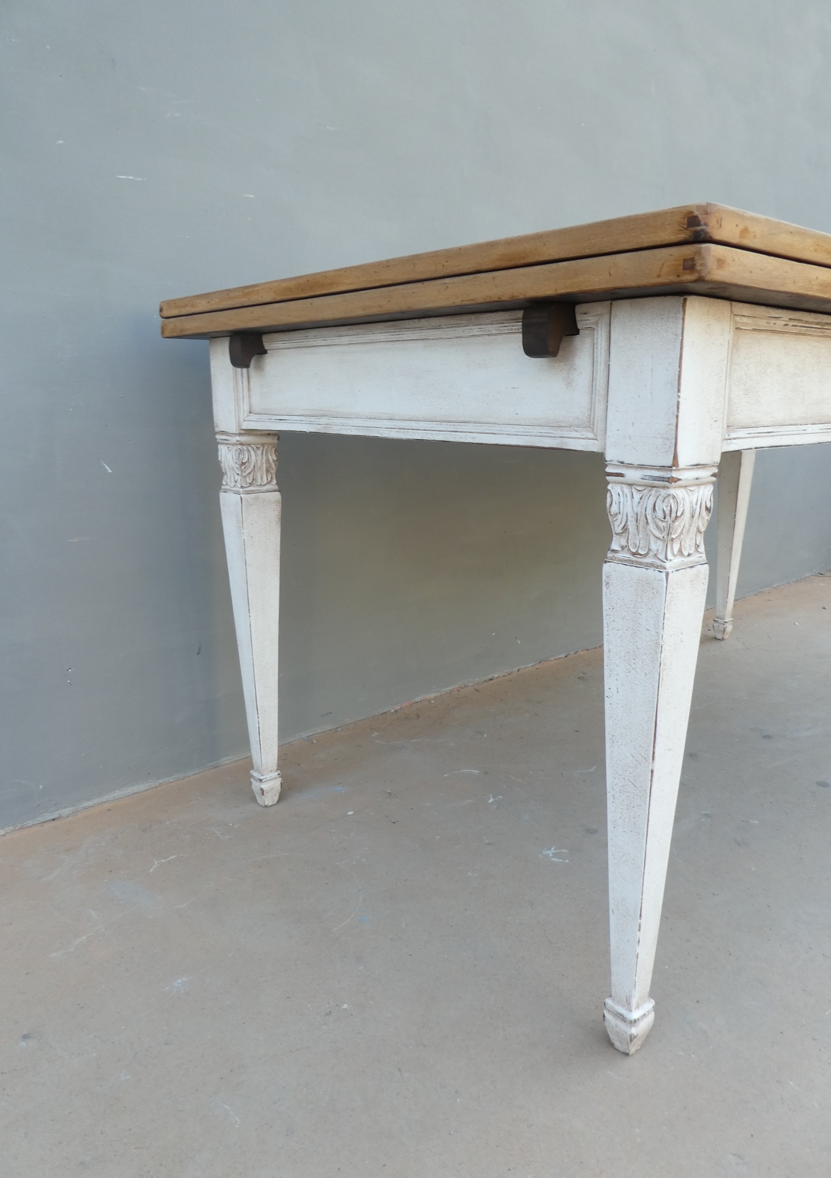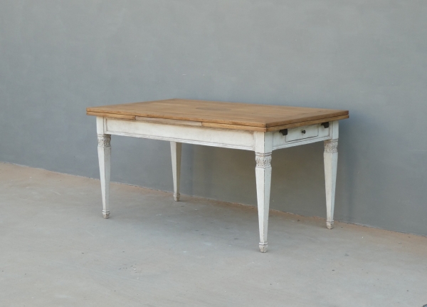 Tavolo rettangolare allungabile a tiro stile Luigi XVI dotato di cassetto laterale. Ciò che rende elegante ed originale questo mobile, è il contrasto creato dalla lacca chiara utilizzata per il cavalletto delle gambe, rifinita con la tecnica Shabby Chic, ed il piano in noce, lasciato a legno. All’occorrenza, si sfilano le allunghe laterali dal sottoplancia per aumentare la superficie d’appoggio. Epoca seconda metà ‘900.