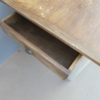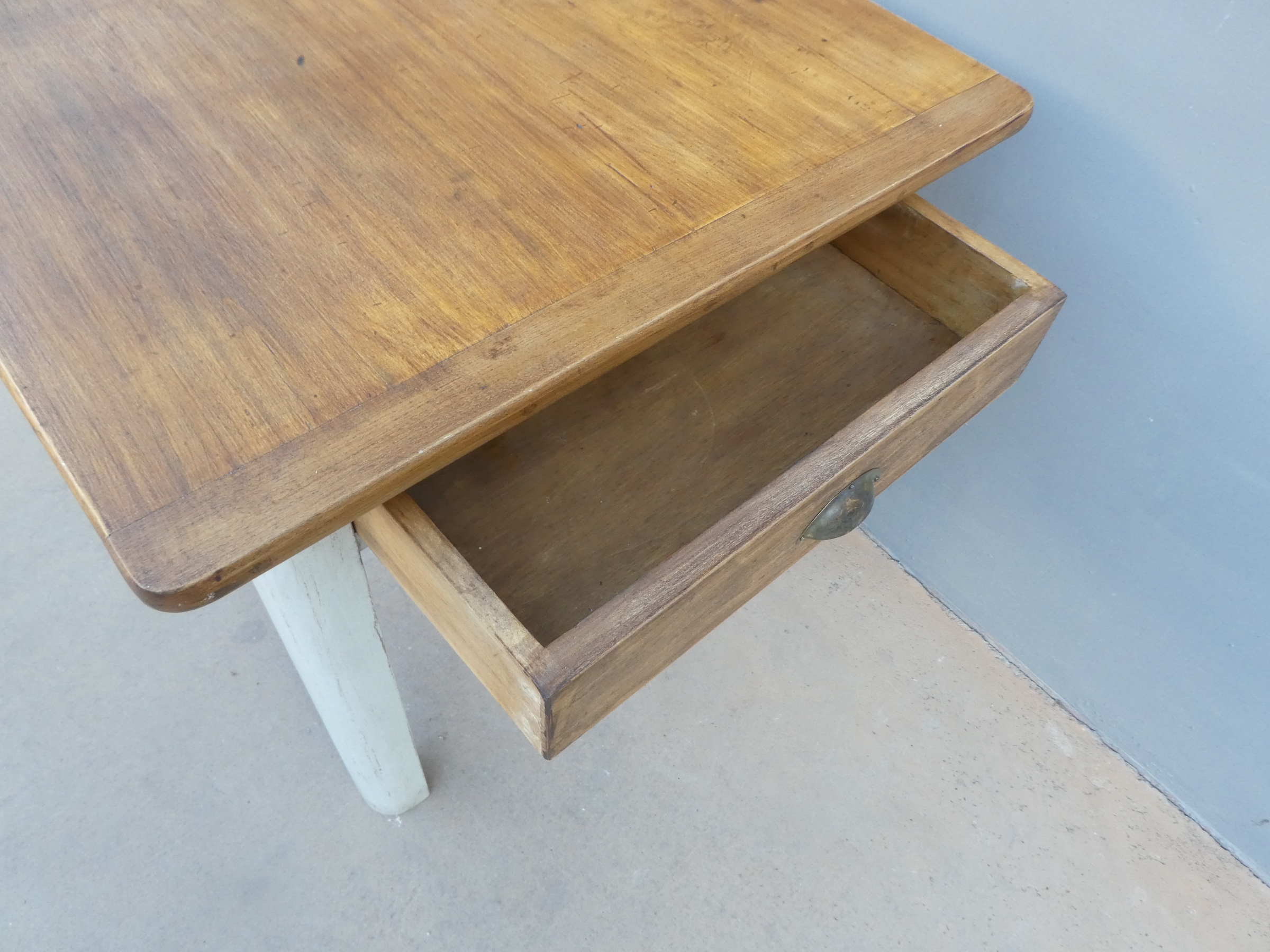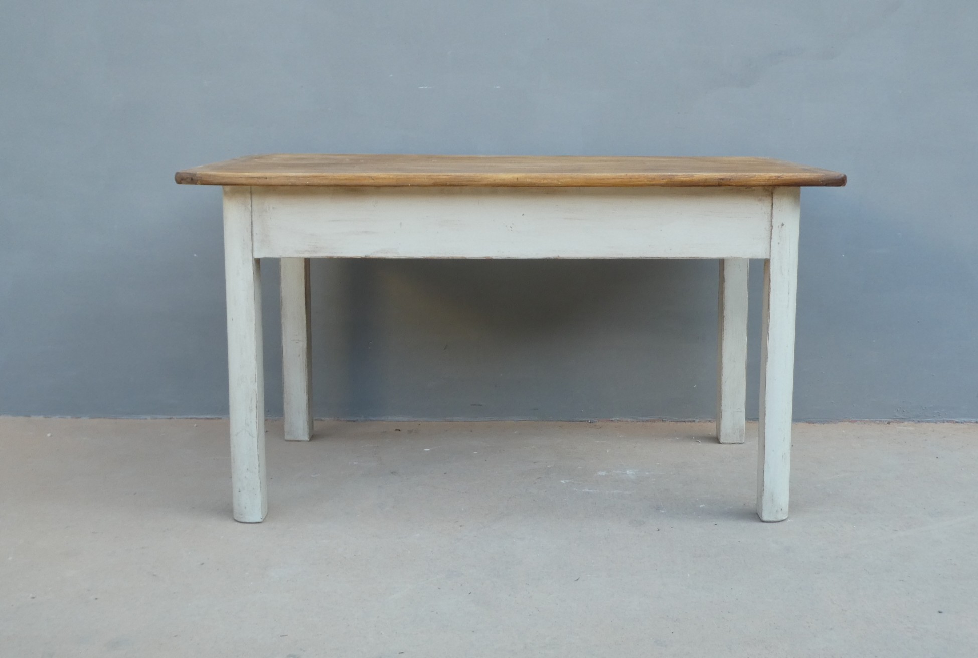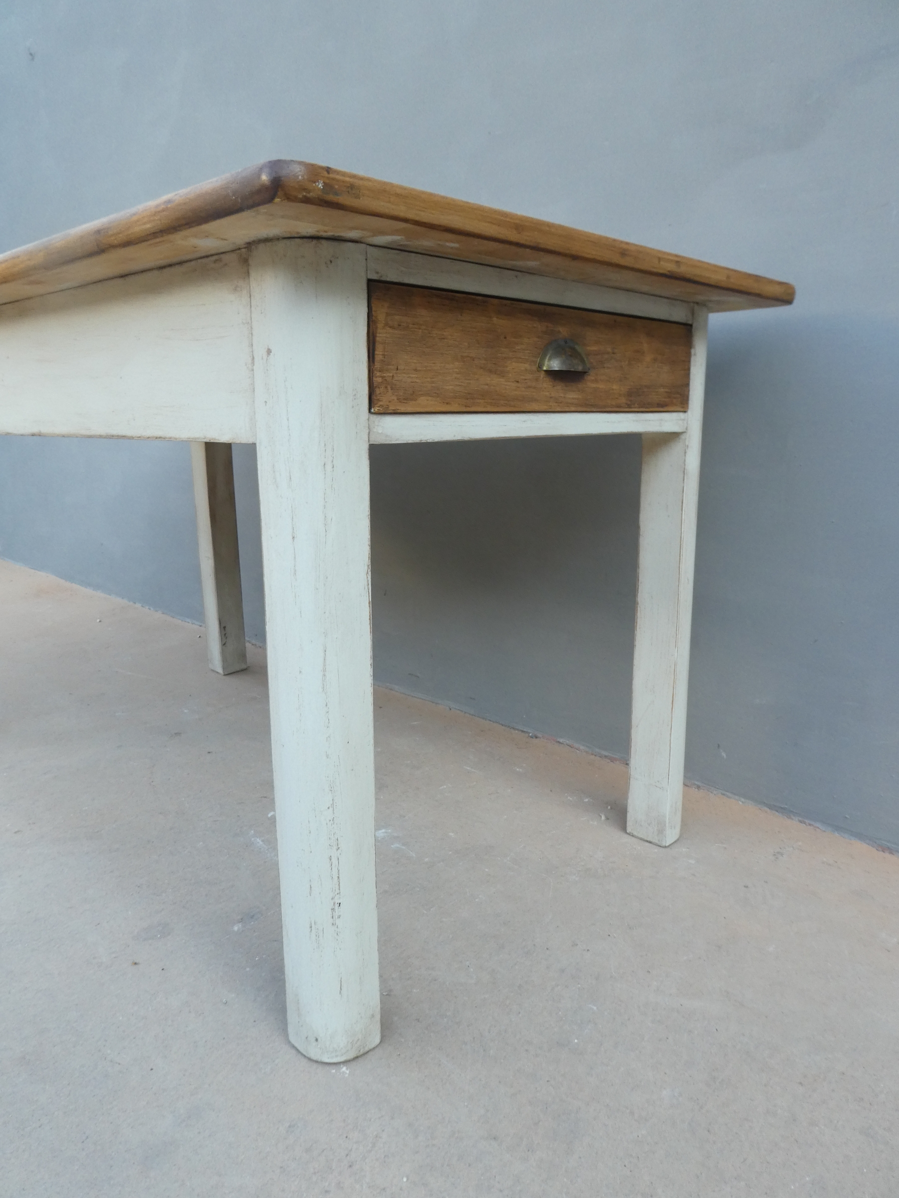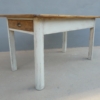 Tavolo rettangolare fisso dotato di due cassetti laterali, laccato e rifinito con la tecnica “Shabby Chic”. Ciò che rende originale questo mobile, è il contrasto creato dalla lacca chiara utilizzata per il cavalletto delle gambe, con il piano ed i cassetti in pioppo, lasciati a legno. Presenta qualche segno d’uso – foto. Epoca metà ‘900.