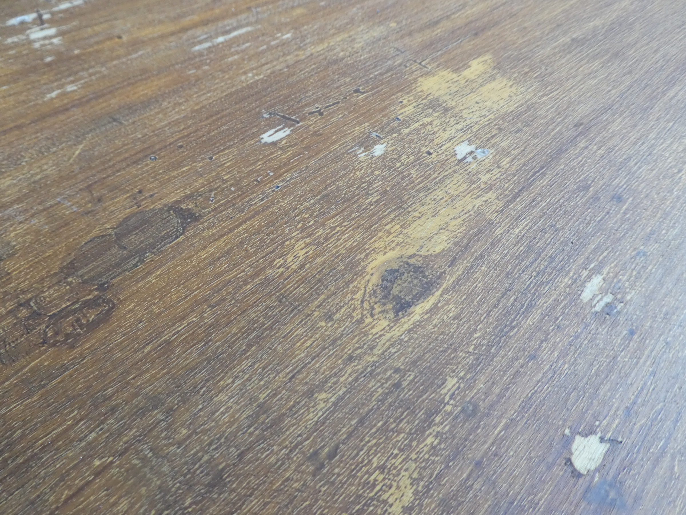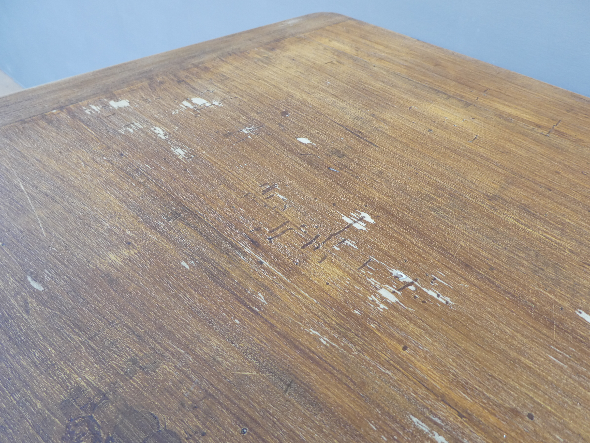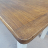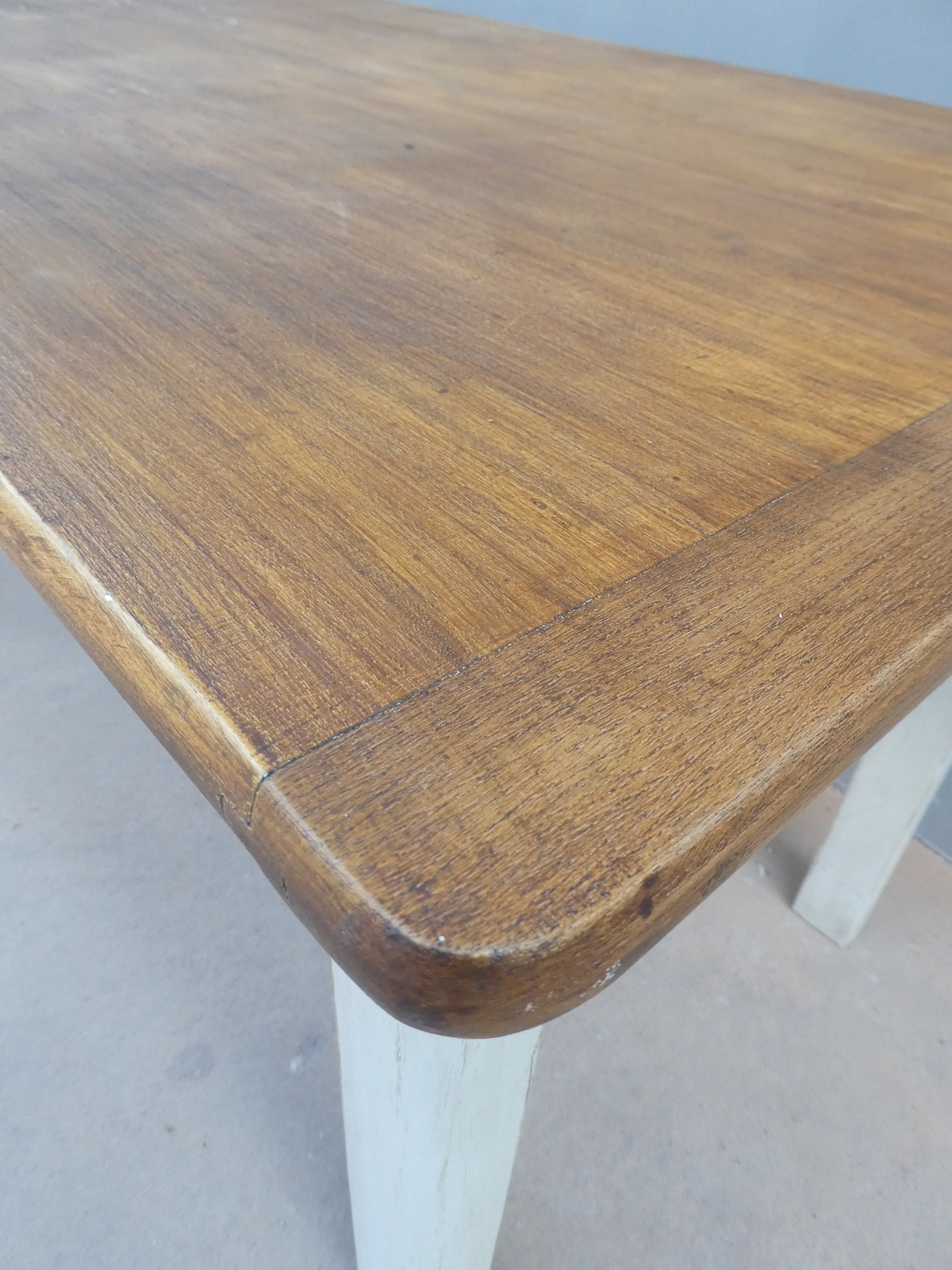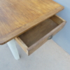 Tavolo rettangolare fisso dotato di due cassetti laterali, laccato e rifinito con la tecnica “Shabby Chic”. Ciò che rende originale questo mobile, è il contrasto creato dalla lacca chiara utilizzata per il cavalletto delle gambe, con il piano ed i cassetti in pioppo, lasciati a legno. Presenta qualche segno d’uso – foto. Epoca metà ‘900.