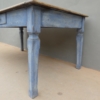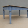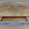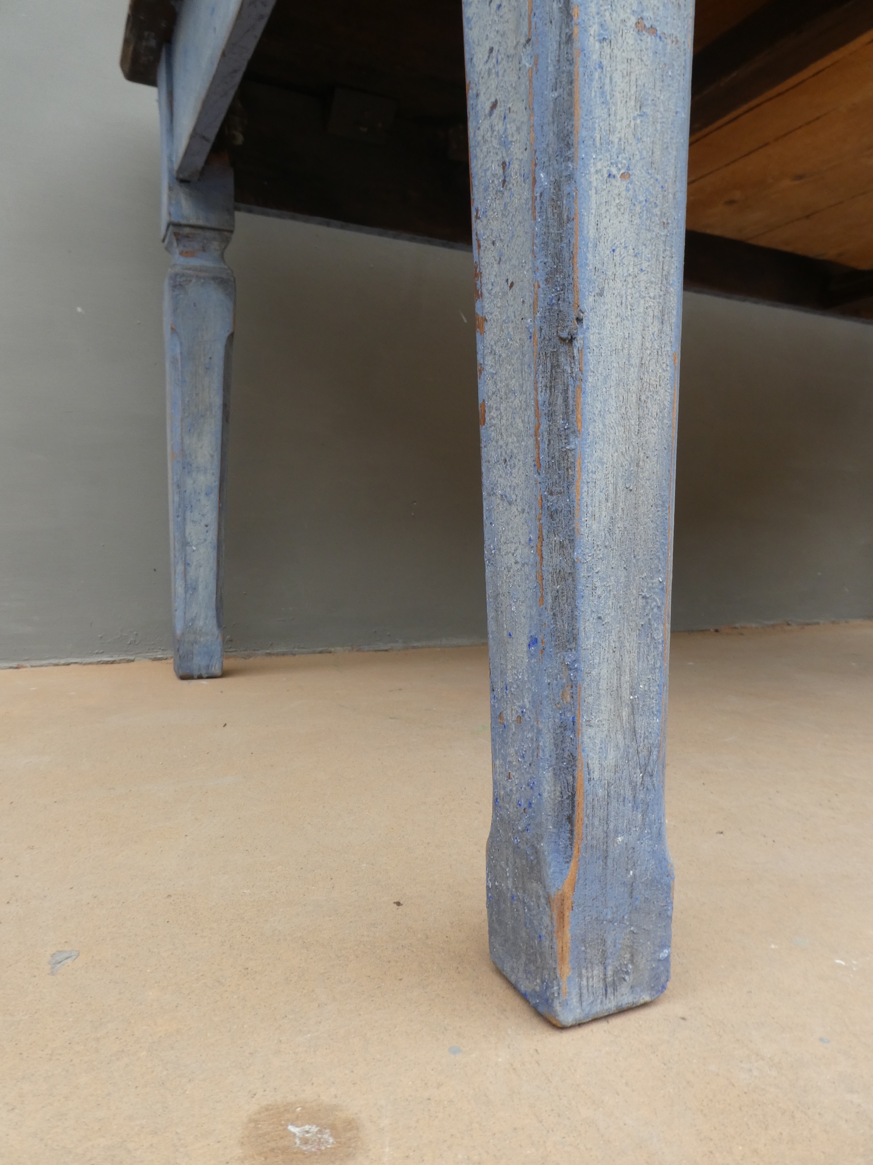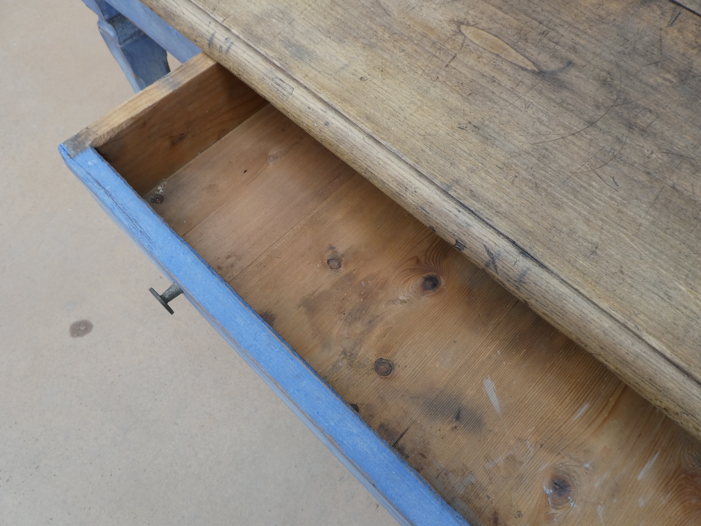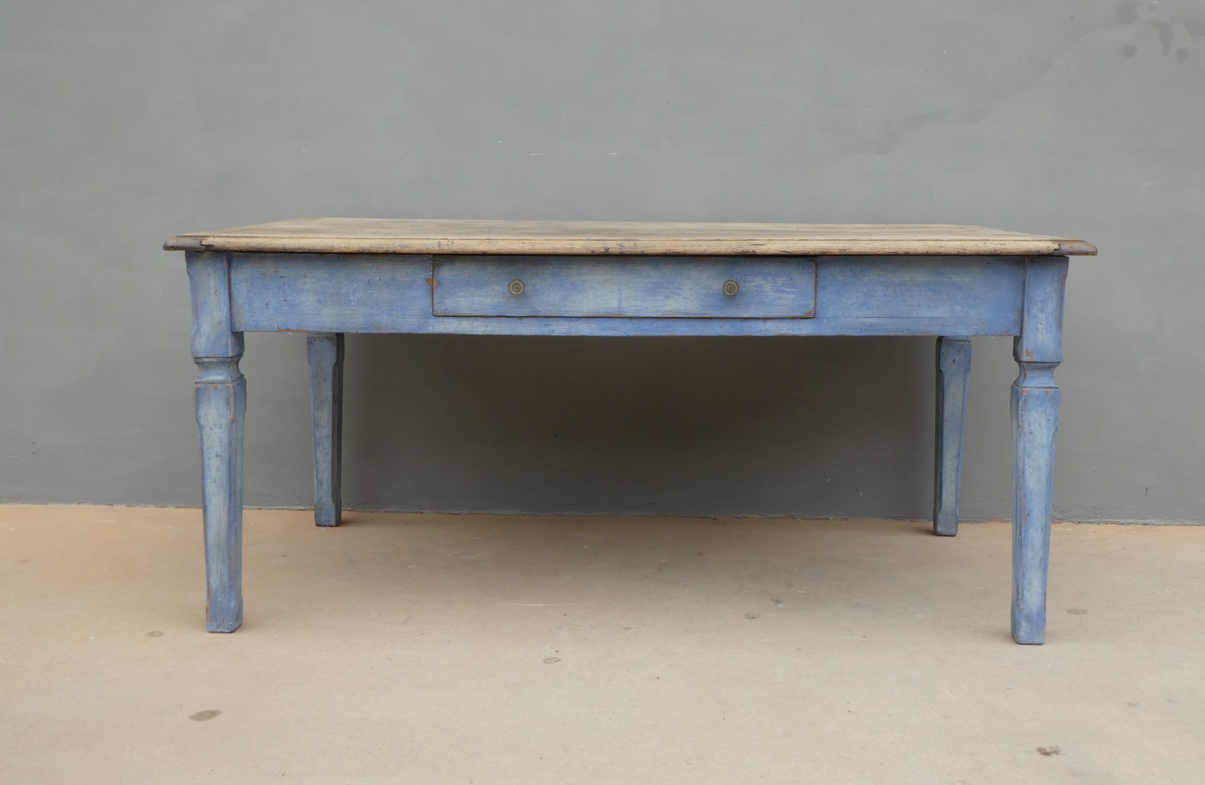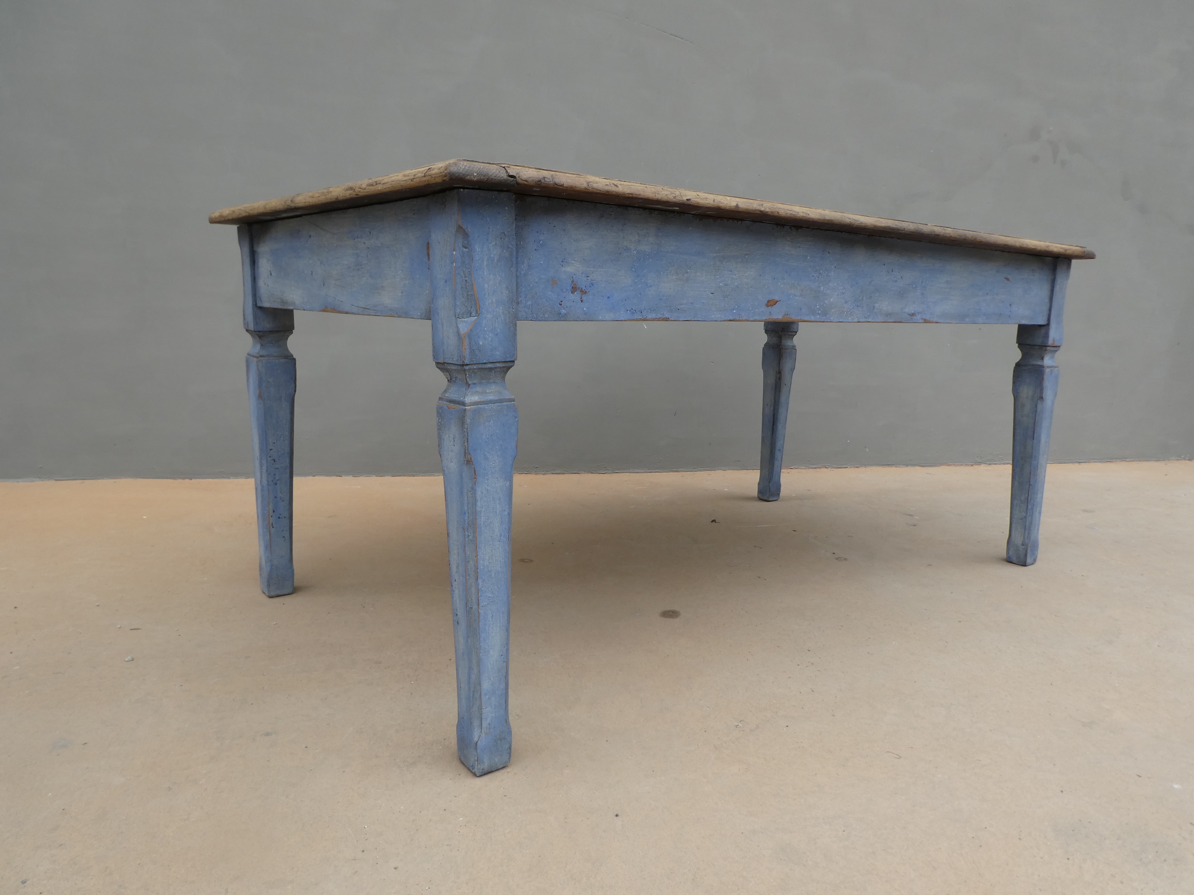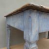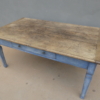 Tavolo fisso rettangolare corredato da un cassetto frontale, laccato e rifinito con la tecnica “Shabby Chic”. Ciò che rende originale questo mobile è il contrasto dato dalla lacca colorata utilizzata per il cavalletto delle gambe, con quella del piano in castagno, lasciato a legno. Epoca fine ‘800.