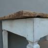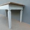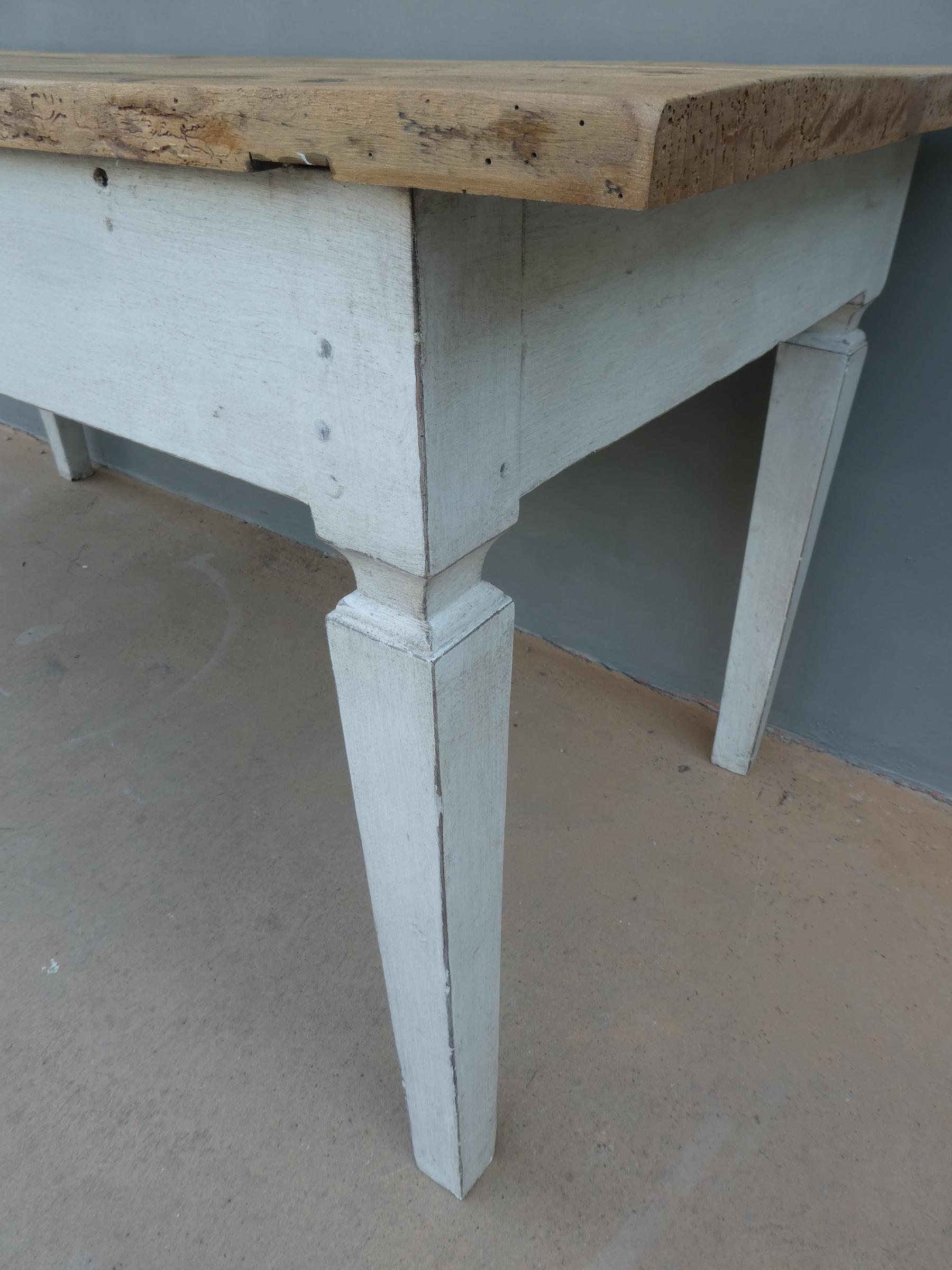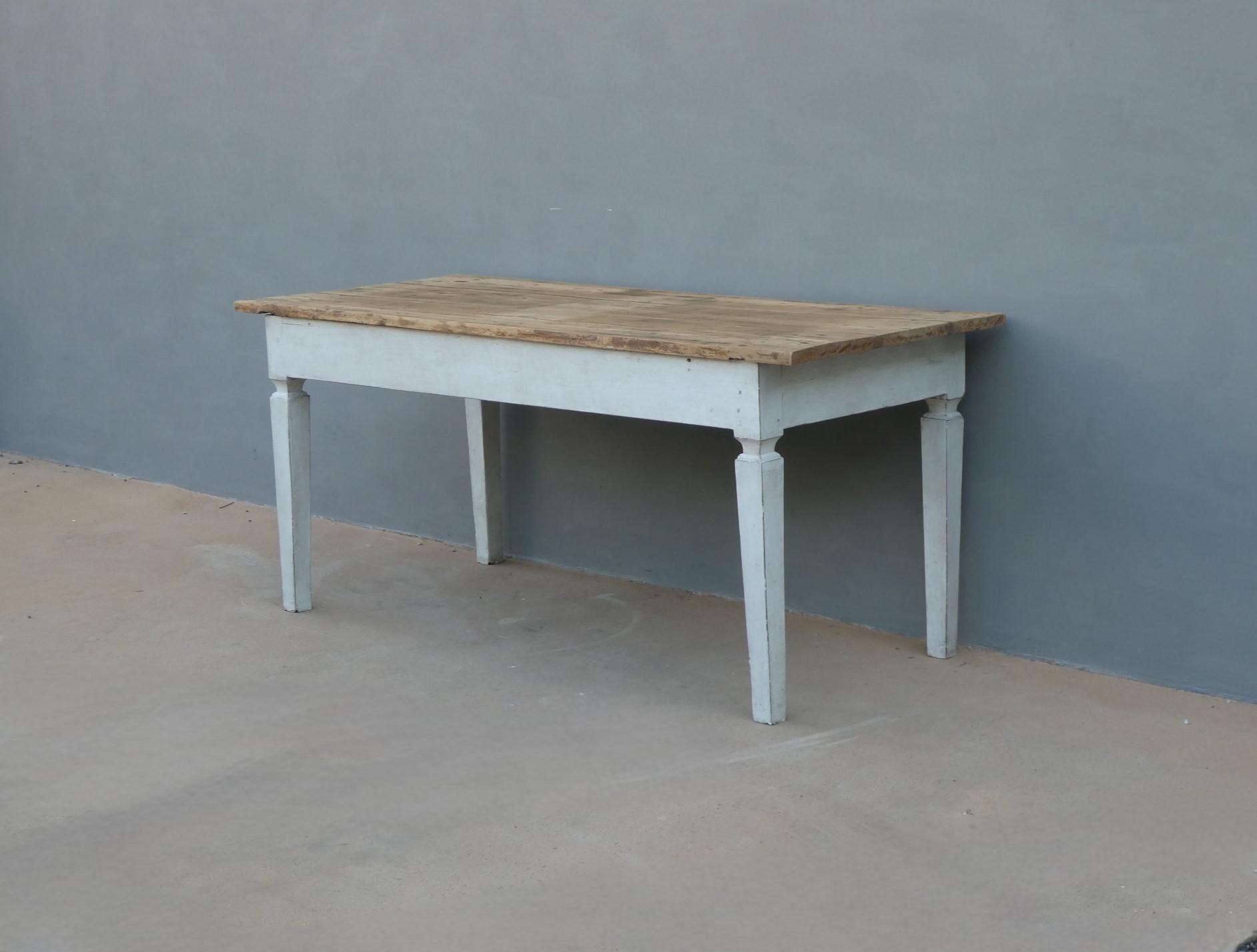 Tavolo fisso rettangolare stile Luigi XVI, laccato e rifinito con la tecnica “Shabby Chic” che prevede l’uso di colori chiari in superficie e colori più scuri che affiorano dopo il trattamento d’usura. Ciò che rende elegante ed originale questo mobile, è il contrasto creato dalla lacca chiara utilizzata per il cavalletto delle gambe, con il piano d’appoggio, lasciato a legno naturale. Presenta fori di tarlo/segni d’usura. Epoca ‘900.