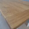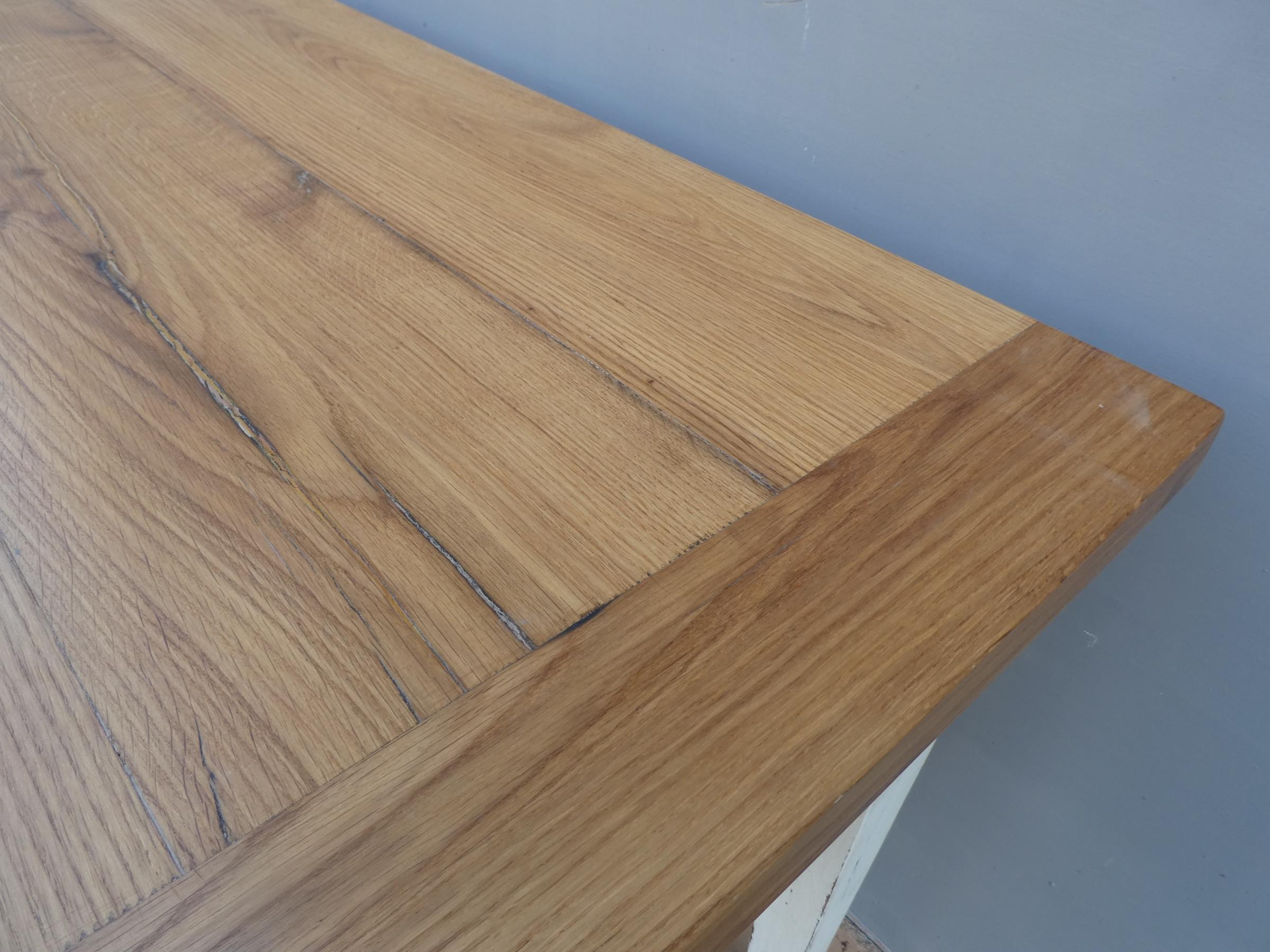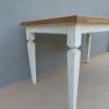 Tavolo fisso rettangolare stile Luigi XVI, laccato e rifinito con la tecnica “Shabby Chic” che prevede l’uso di colori chiari in superficie e colori più scuri che affiorano dopo il trattamento d’usura. Ciò che rende elegante ed originale questo mobile, è il contrasto creato dalla lacca chiara utilizzata per il cavalletto delle gambe, con il piano d’appoggio in rovere (non coevo), lasciato a legno naturale. Epoca ‘900.