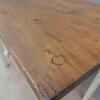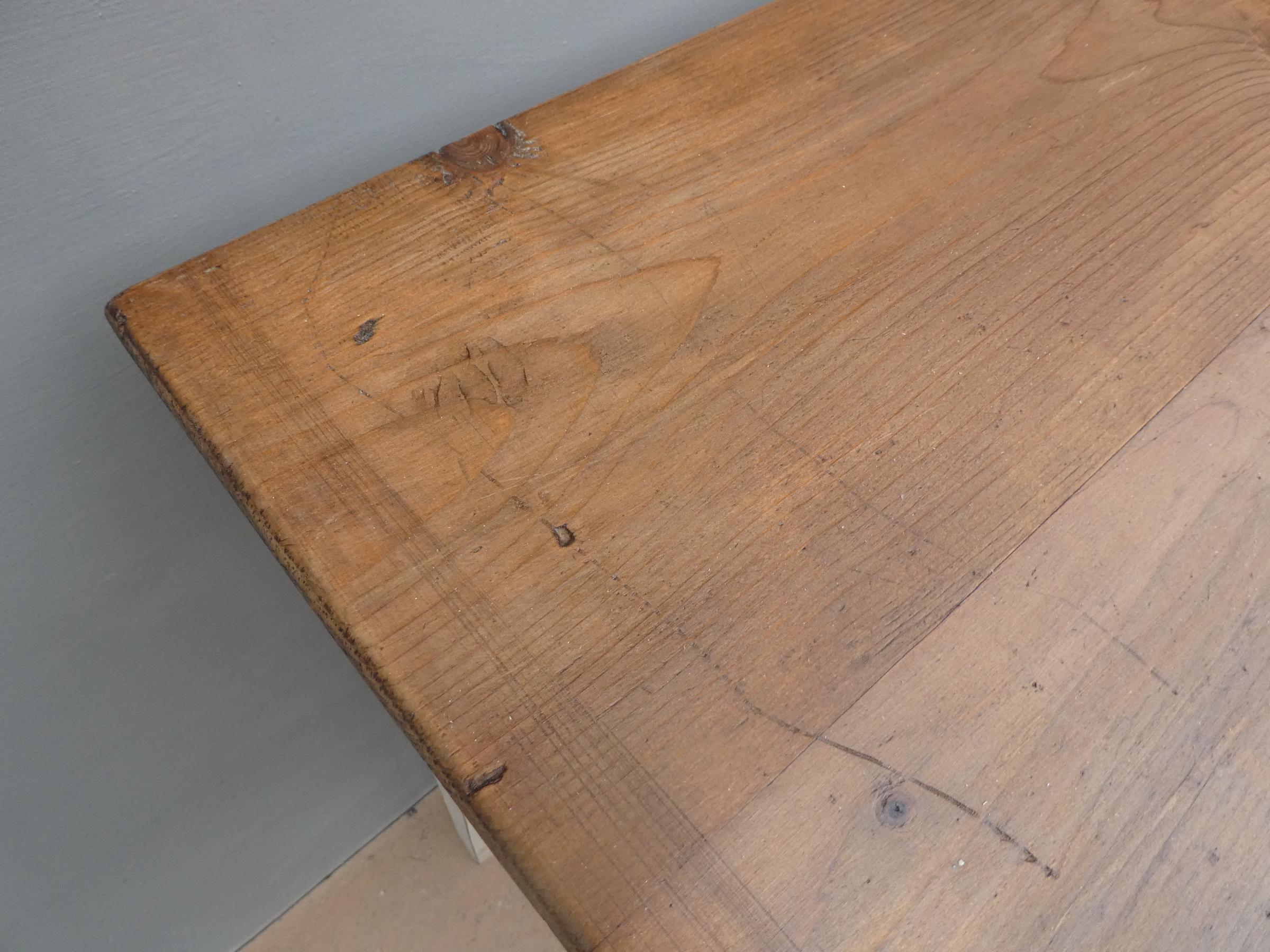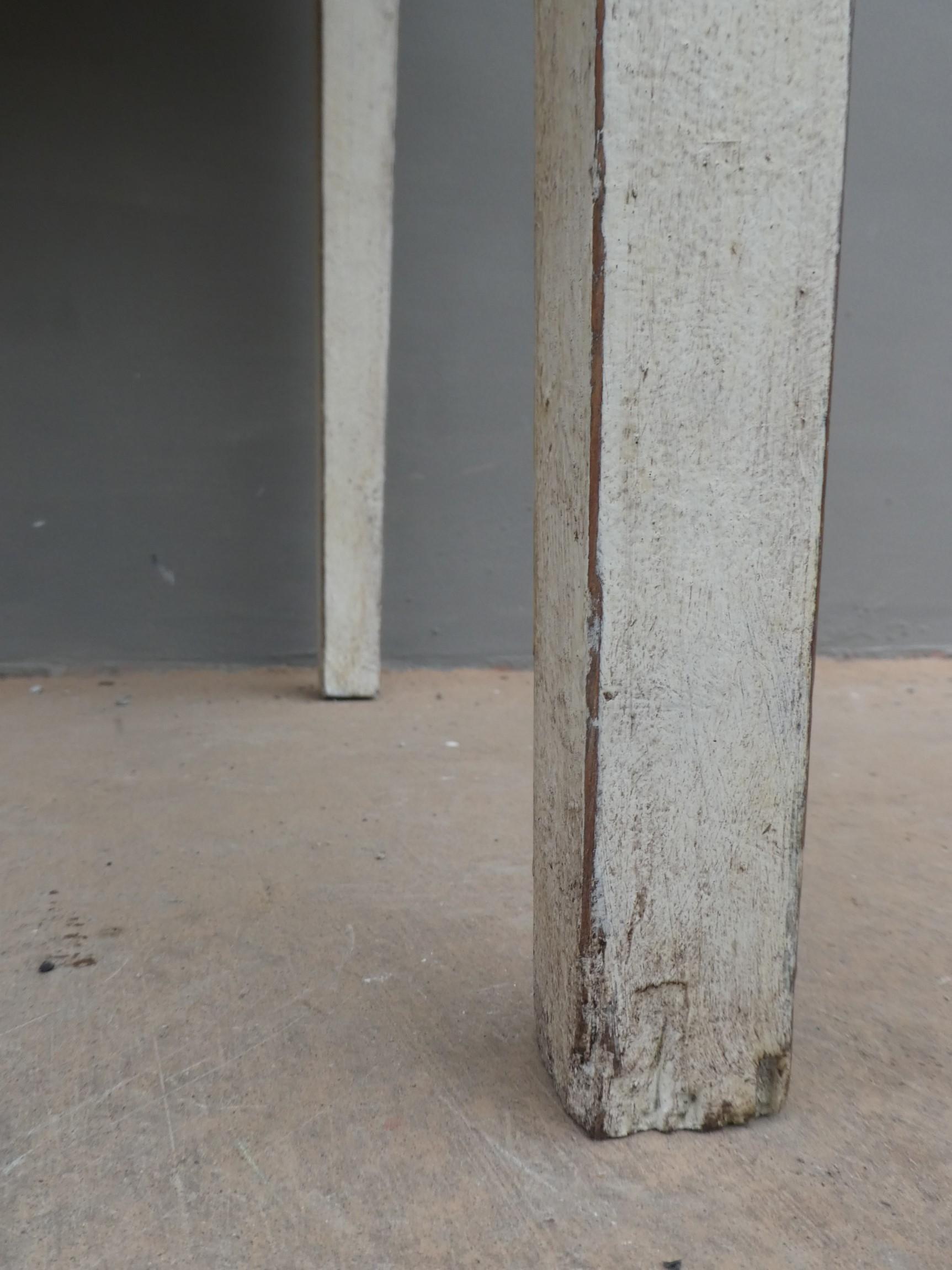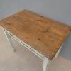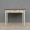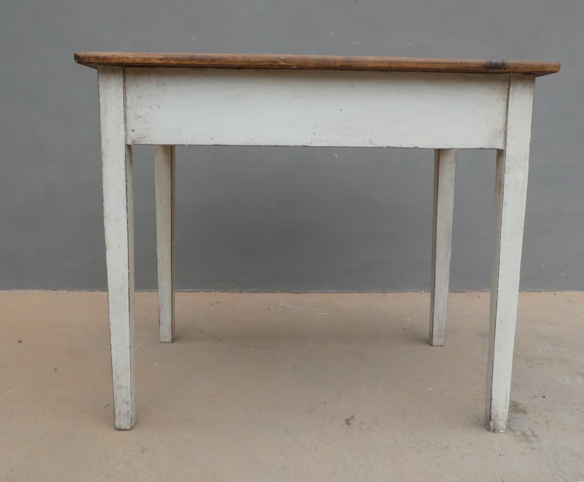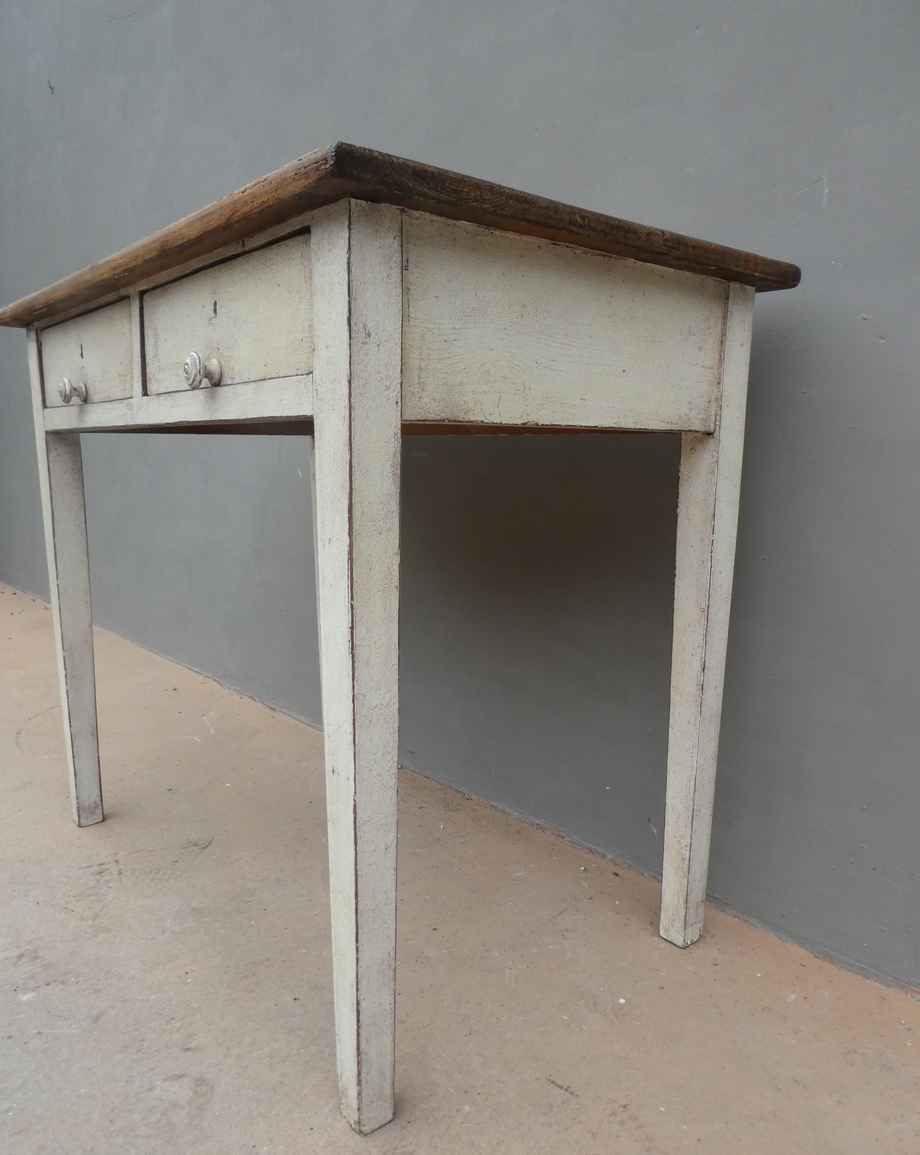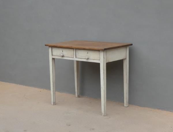 Tavolo scrittoio rettangolare dotato di due cassetti frontali, laccato e rifinito con la tecnica “Shabby Chic”. Ciò che rende elegante ed originale questo mobile, è il contrasto creato dalla lacca utilizzata per il cavalletto delle gambe, con quella del piano in abete, lasciato a legno. Presenta quache foro di tarlo (foto). Epoca fine ‘800.