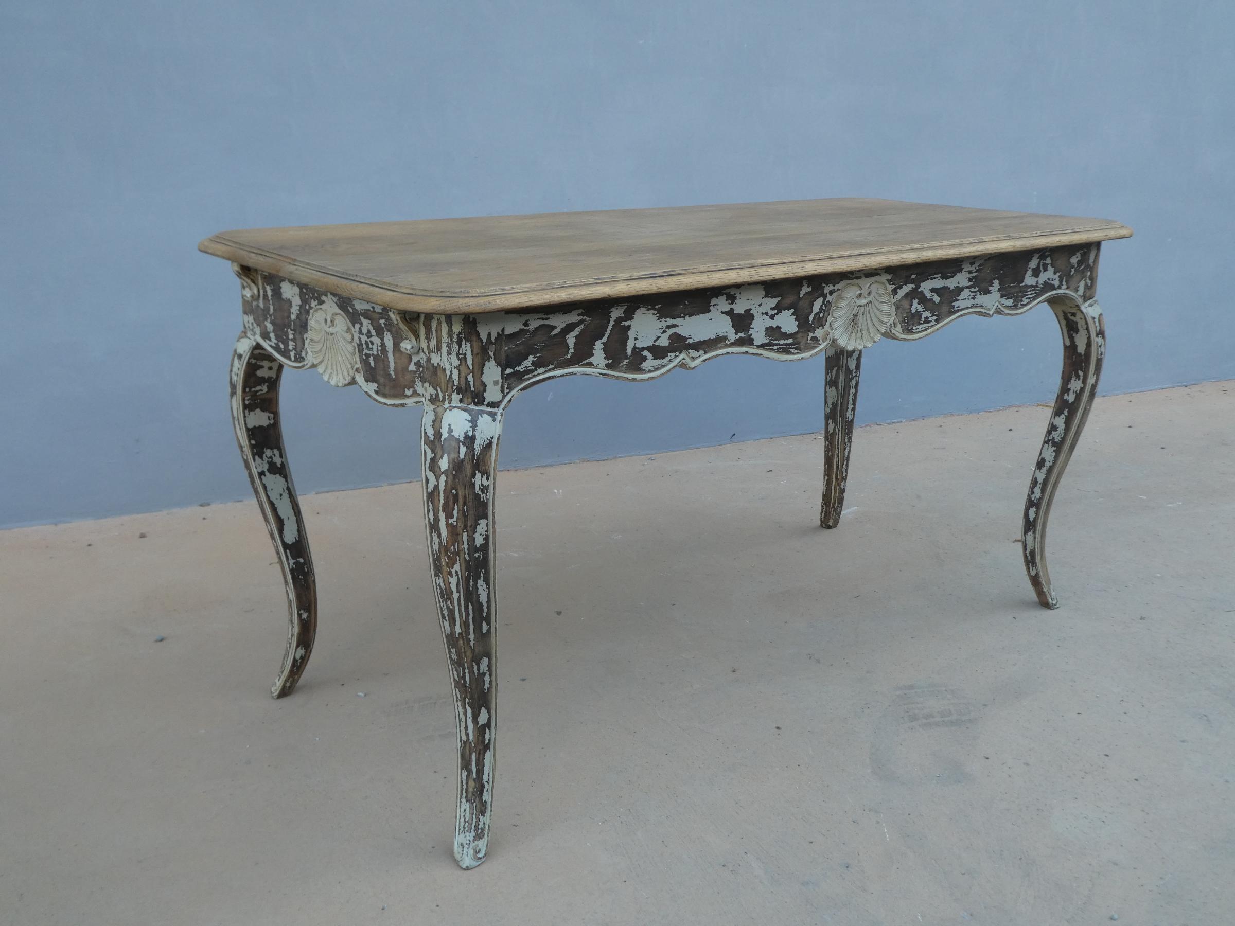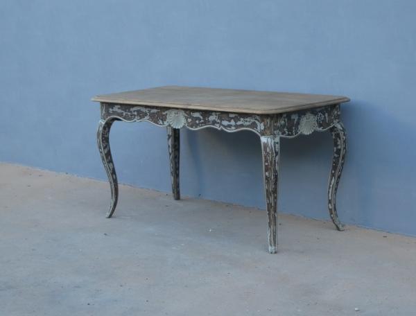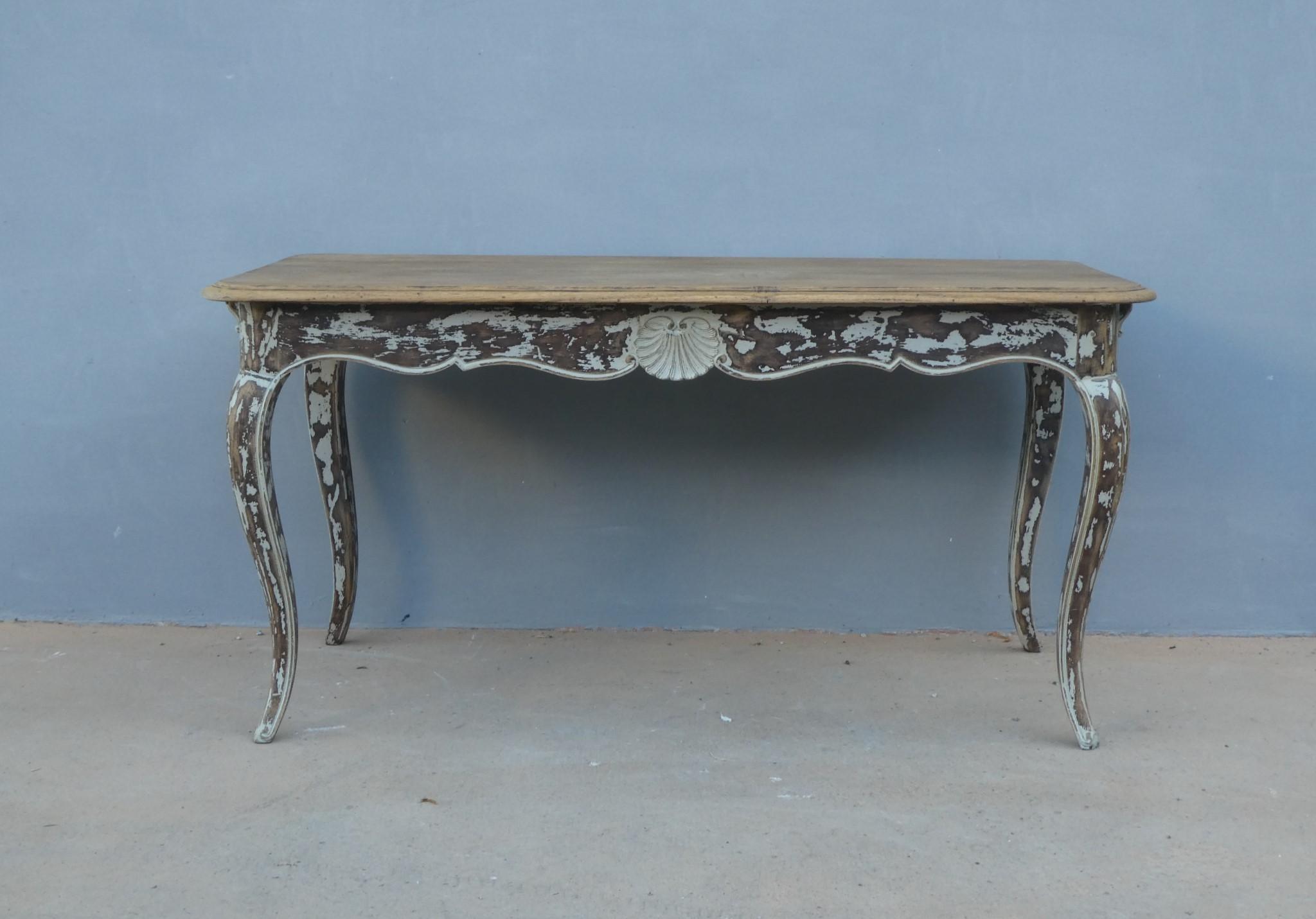 Tavolo rettangolare stile provenzale francese, laccato e rifinito con la tecnica “Shabby Chic” che prevede l’uso di colori chiari e colori più scuri che affiorano dopo il trattamento d’usura. Ciò che rende elegante ed originale questo tavolo, è il contrasto creato dal particolare effetto della lacca utilizzata per il cavalletto delle gambe, con il piano in rovere, lasciato a legno. Non dispone di allunghe laterali. Epoca metà ‘900.