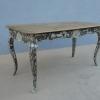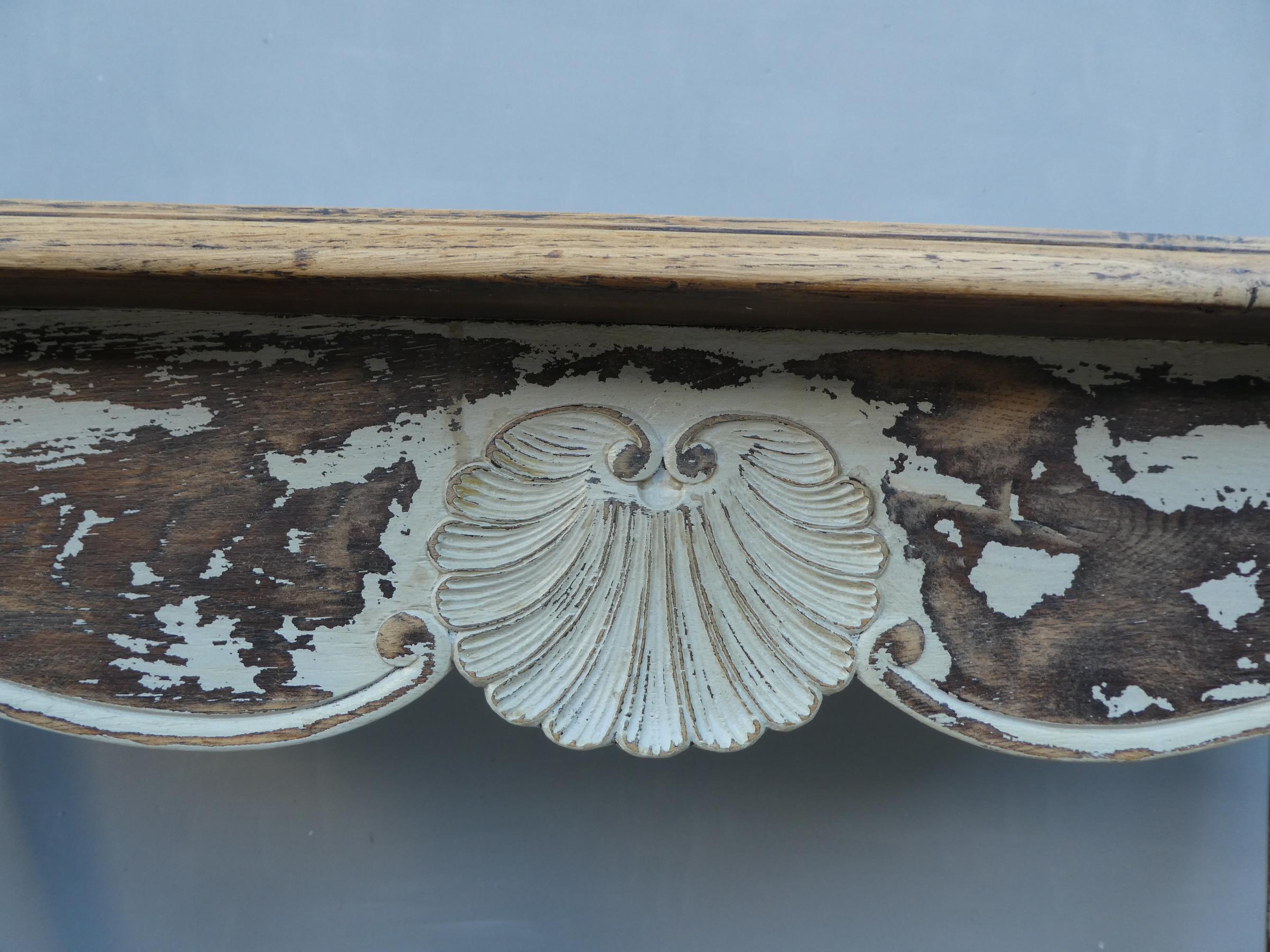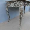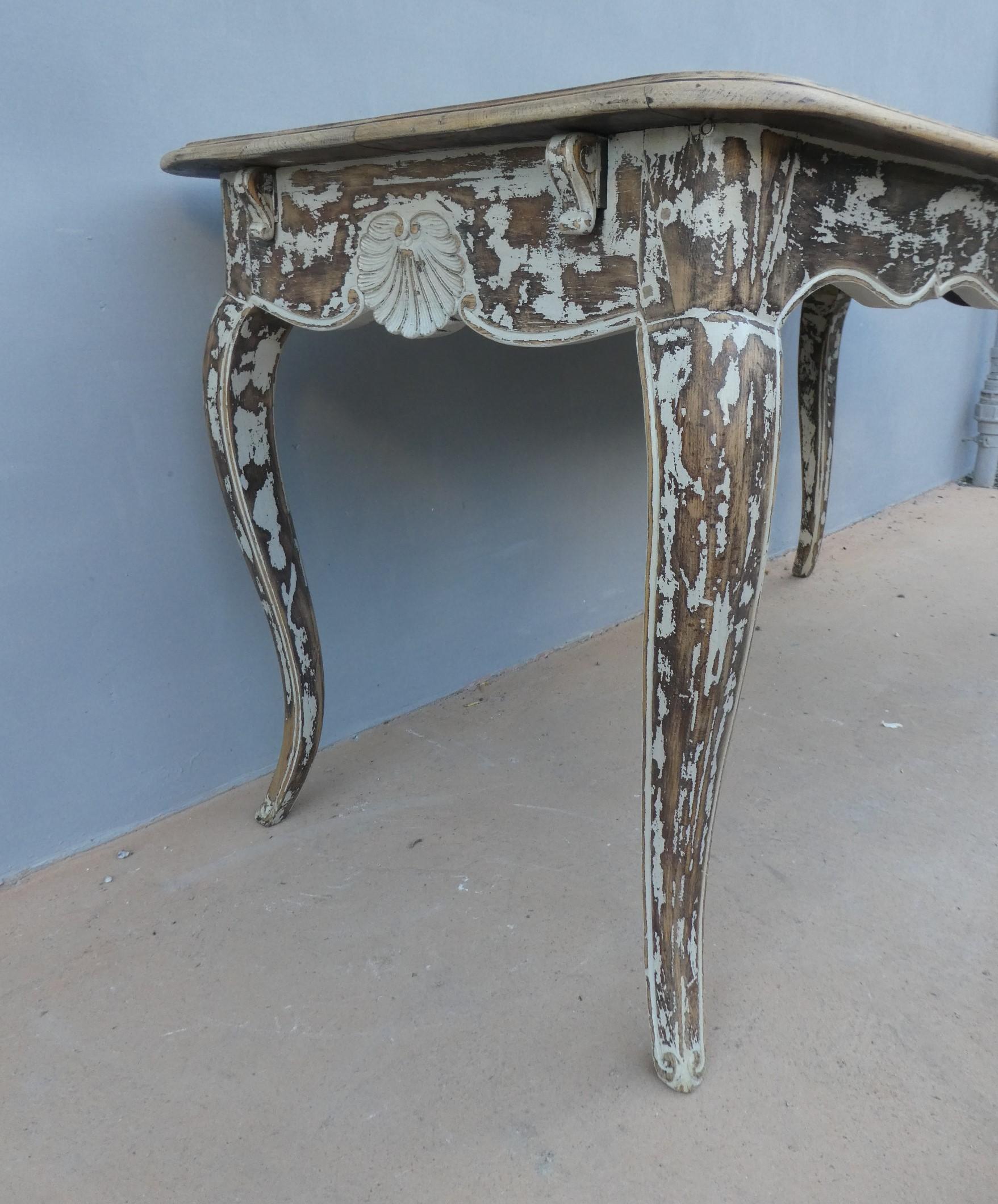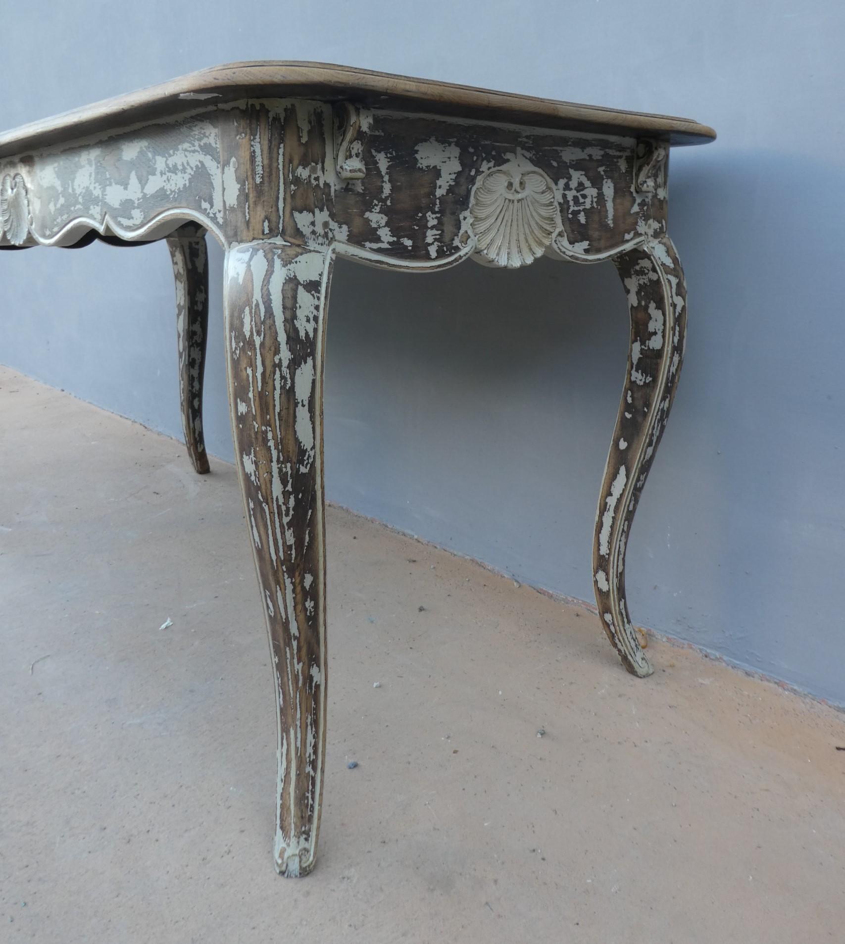Tavolo rettangolare stile provenzale francese, laccato e rifinito con la tecnica “Shabby Chic” che prevede l’uso di colori chiari e colori più scuri che affiorano dopo il trattamento d’usura. Ciò che rende elegante ed originale questo tavolo, è il contrasto creato dal particolare effetto della lacca utilizzata per il cavalletto delle gambe, con il piano in rovere, lasciato a legno. Non dispone di allunghe laterali. Epoca metà ‘900.
