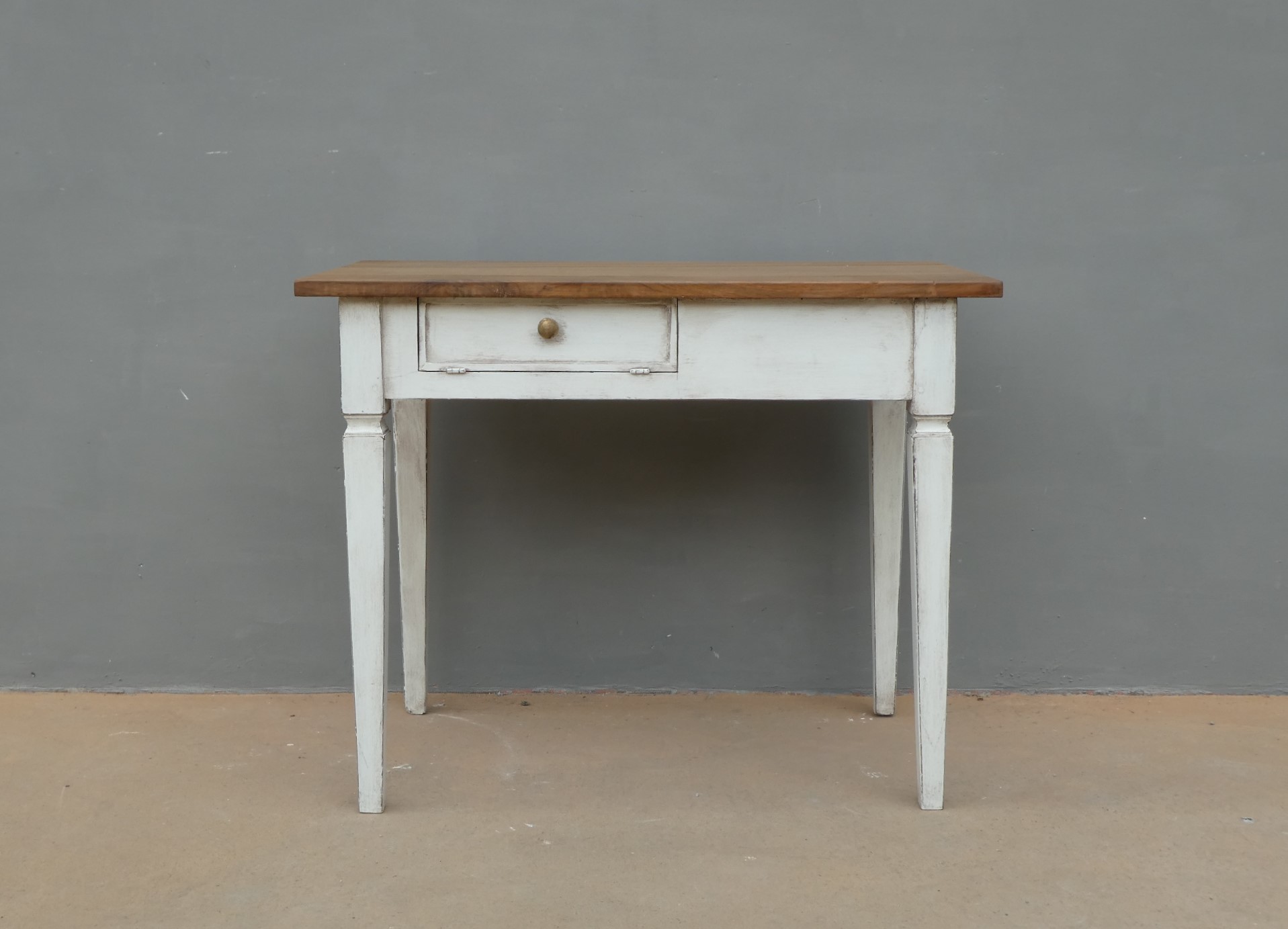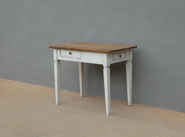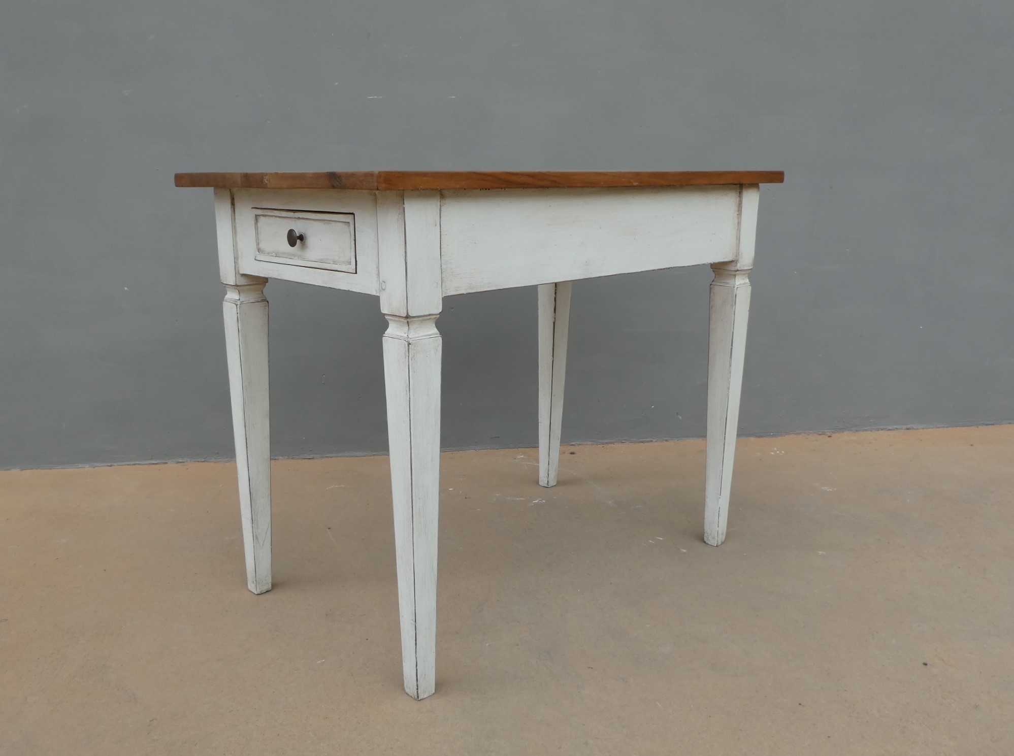 Tavolo tavolino rettangolare Luigi XVI dotato di un cassetto frontale ed uno laterale, laccato e rifinito con la tecnica “Shabby Chic”. Ciò che rende elegante ed originale questo mobile, è il contrasto creato dalla lacca chiara utilizzata per il cavalletto delle gambe, con il piano in noce, lasciato a legno. Presenta piccoli fori di tarlo (foto). Epoca ‘800.