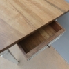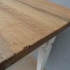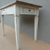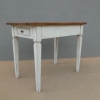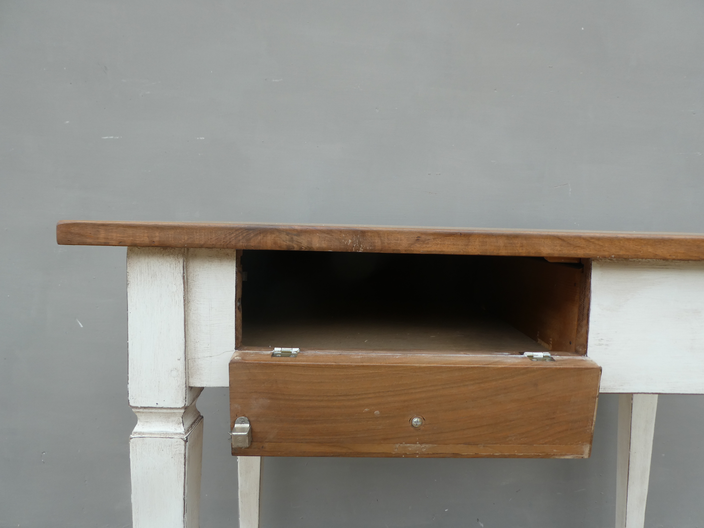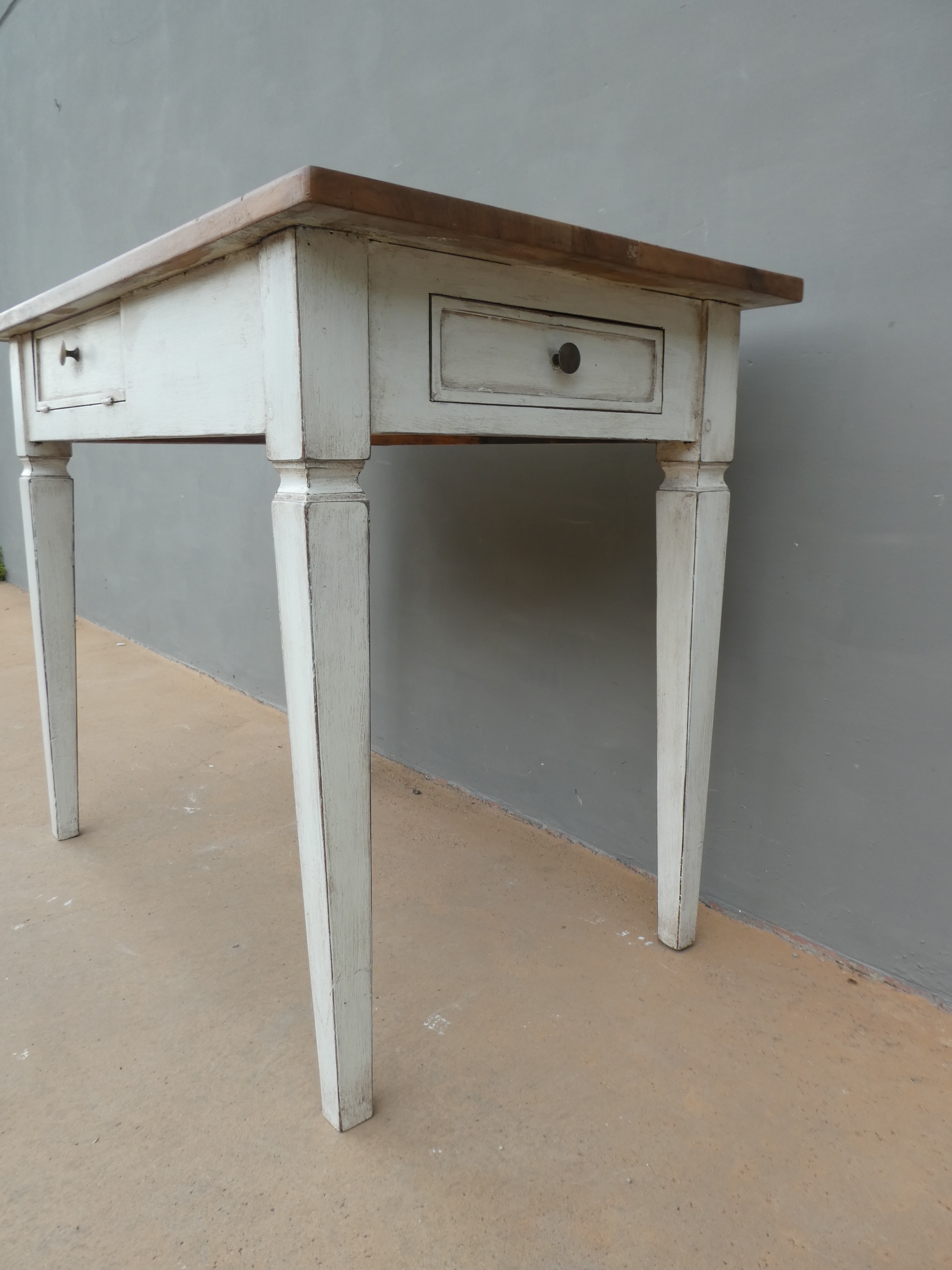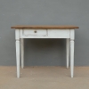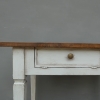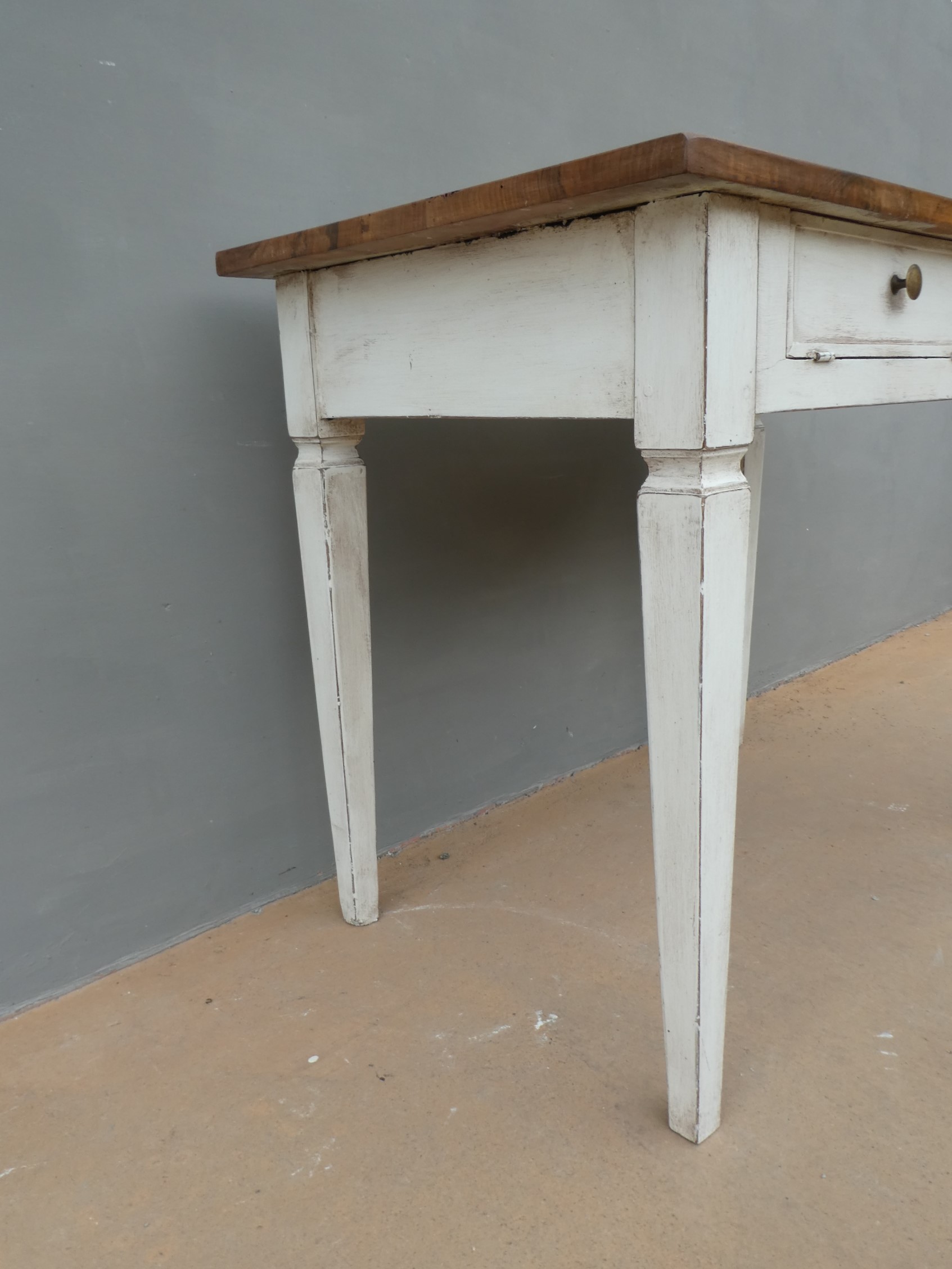Tavolo tavolino rettangolare Luigi XVI dotato di un cassetto frontale ed uno laterale, laccato e rifinito con la tecnica “Shabby Chic”. Ciò che rende elegante ed originale questo mobile, è il contrasto creato dalla lacca chiara utilizzata per il cavalletto delle gambe, con il piano in noce, lasciato a legno. Presenta piccoli fori di tarlo (foto). Epoca ‘800.