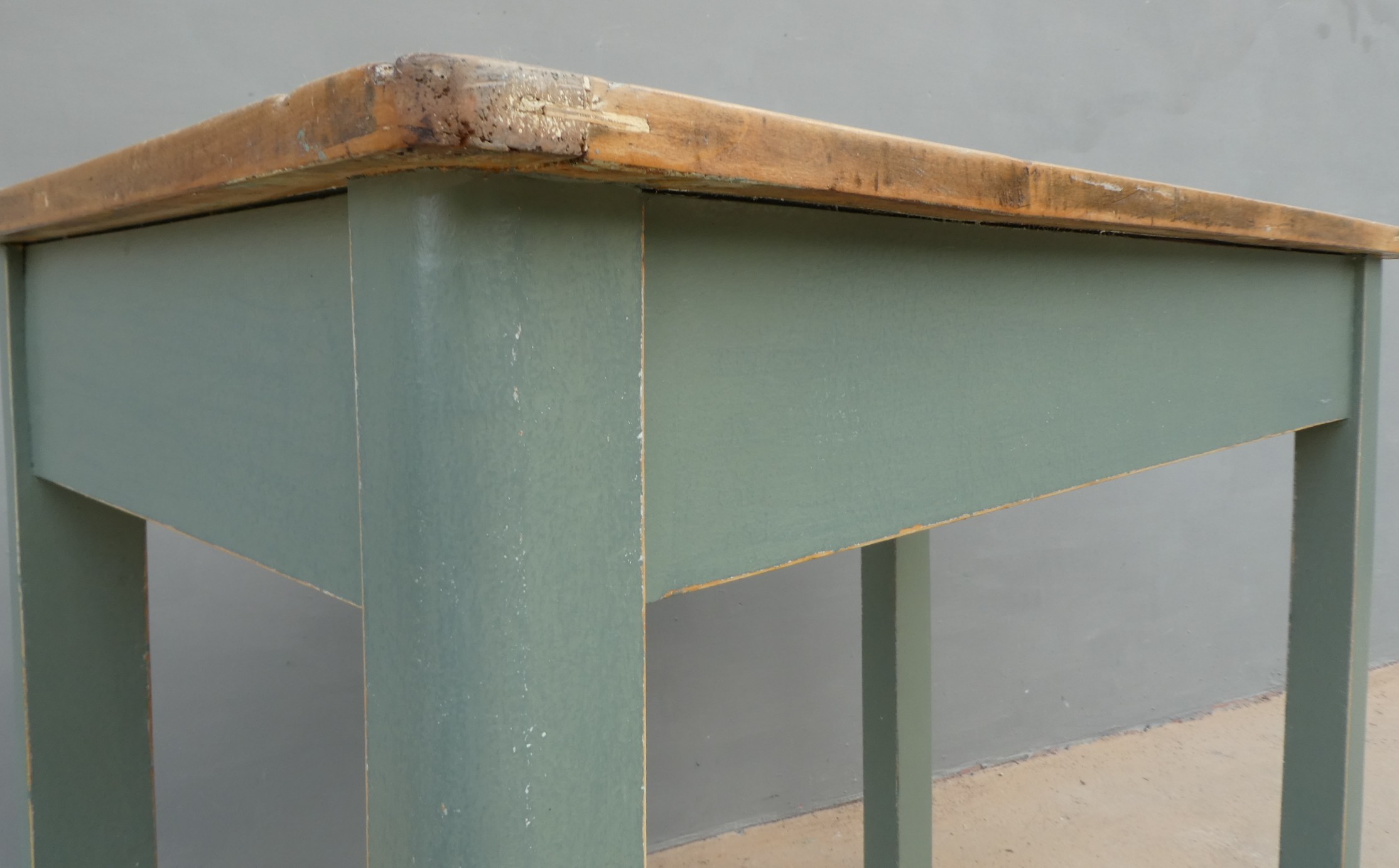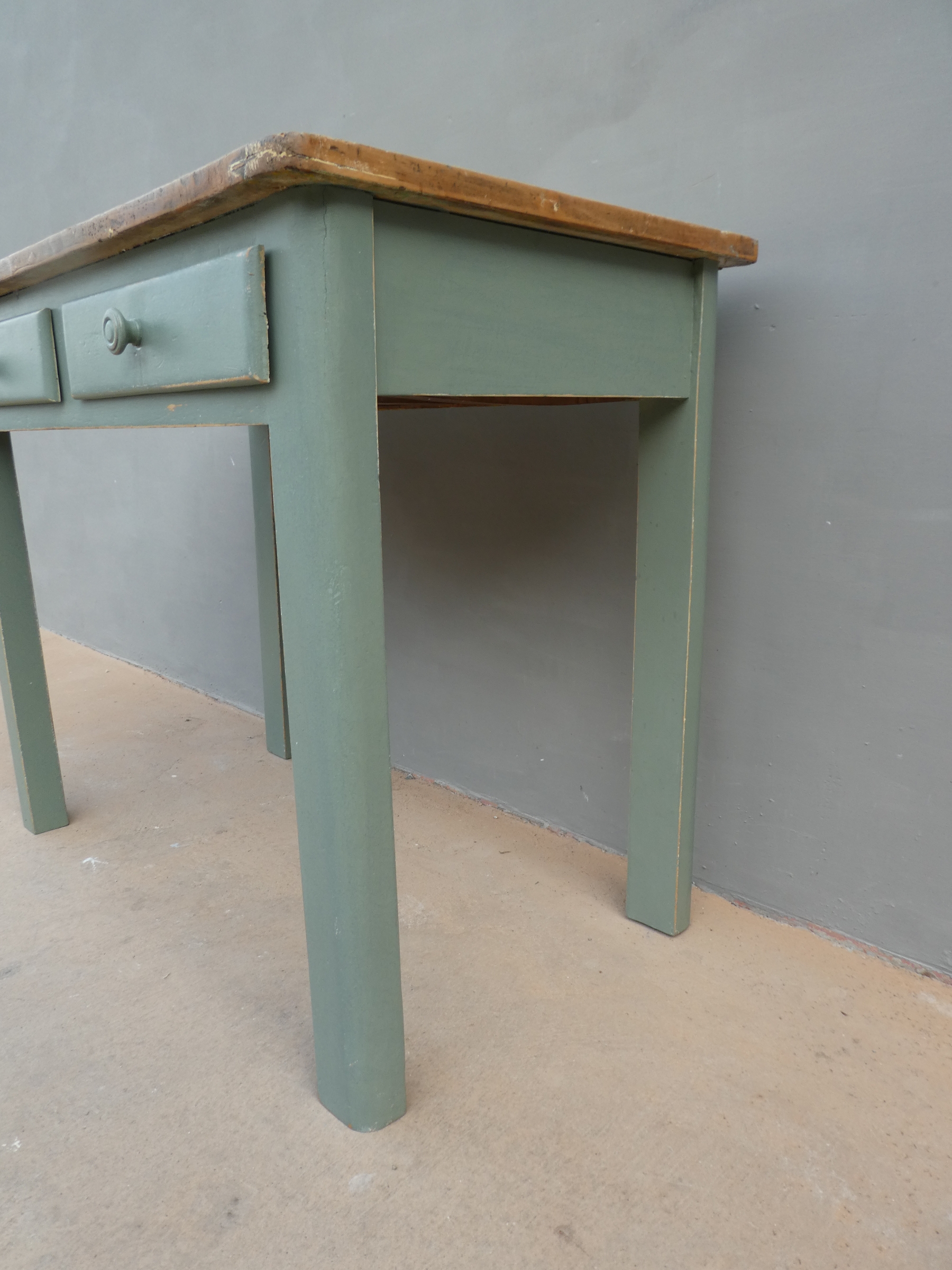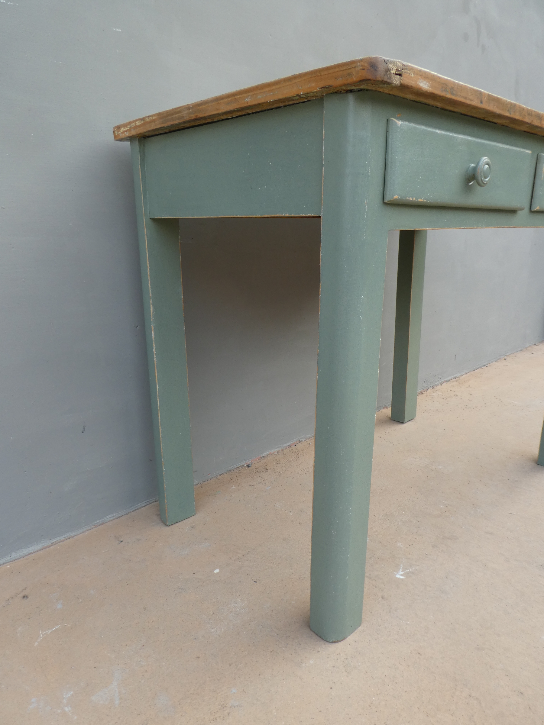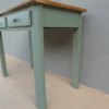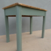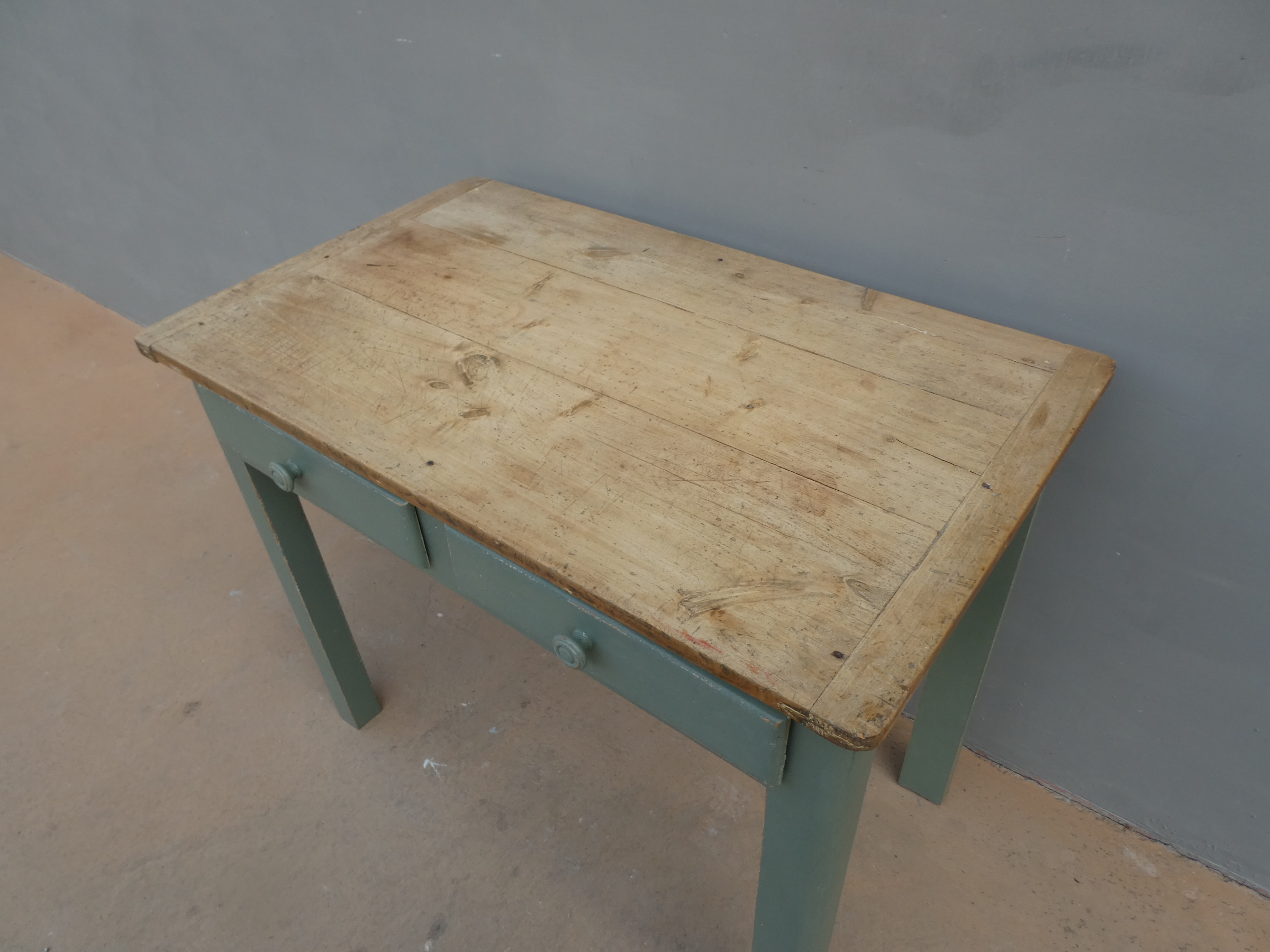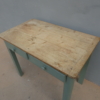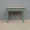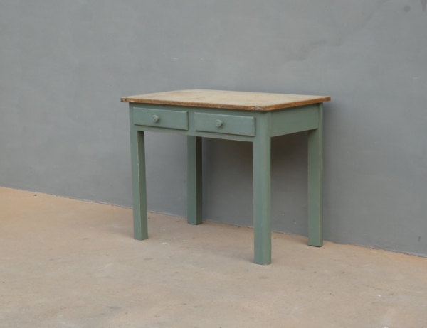 Tavolo tavolino scrittoio rettangolare fisso dotato di due cassetti frontali, laccato e rifinito con la tecnica “Shabby Chic”. Ciò che rende originale questo mobile è il contrasto creato dalla lacca colorata utilizzata per il cavalletto delle gambe, con il piano in pioppo, lasciato a legno. Necessita di alcuni interventi di restauro, sono presenti fori di tarlo (foto). Epoca metà ‘900.