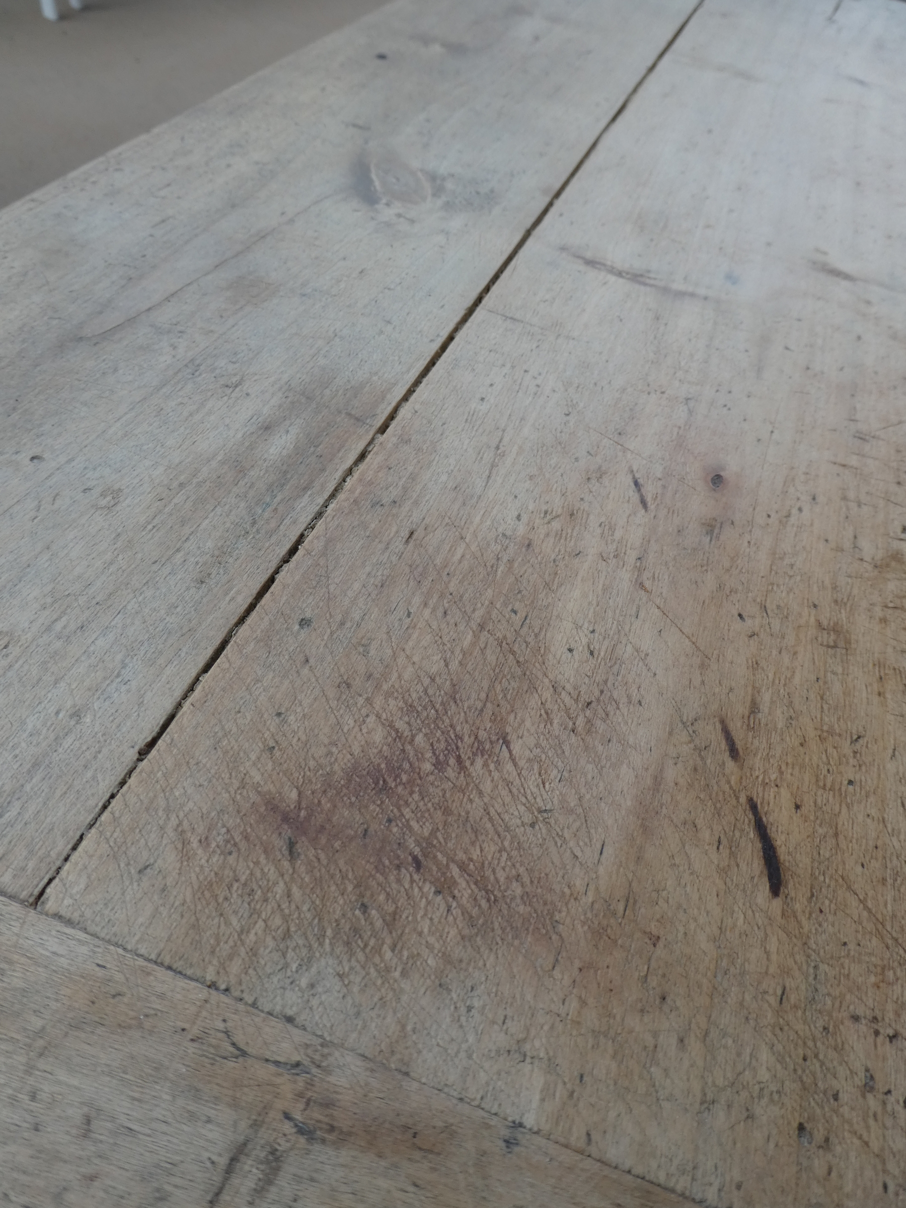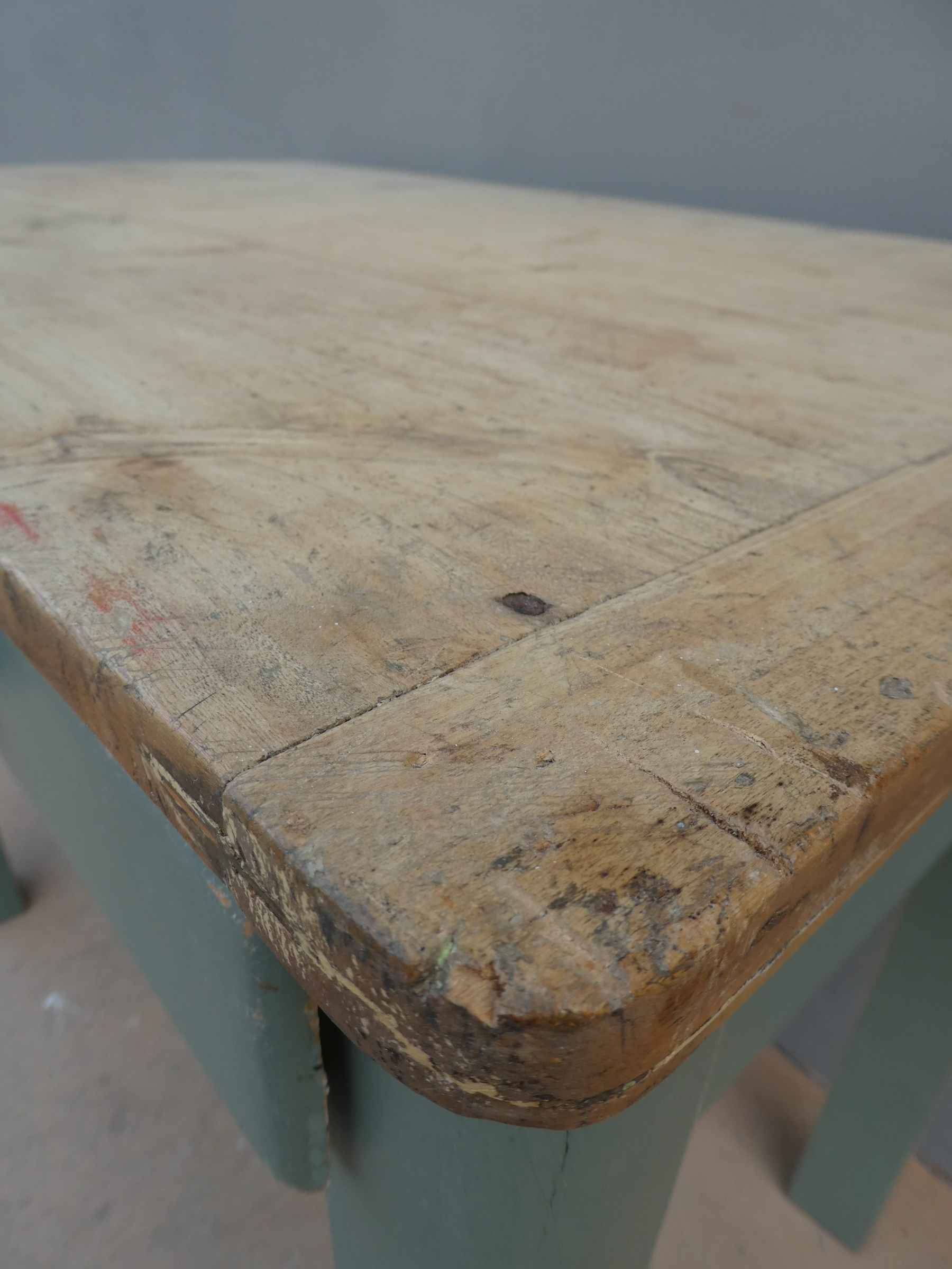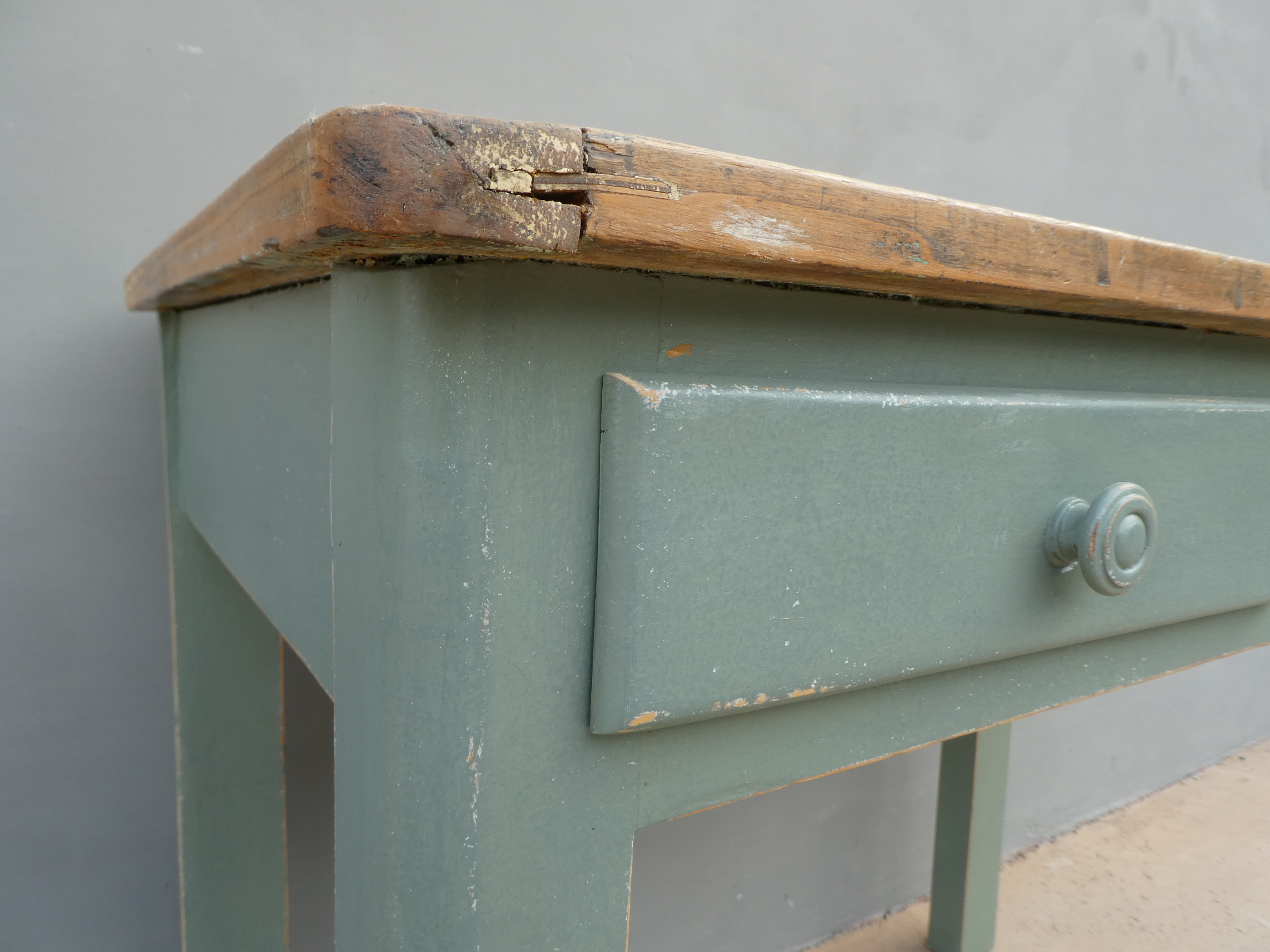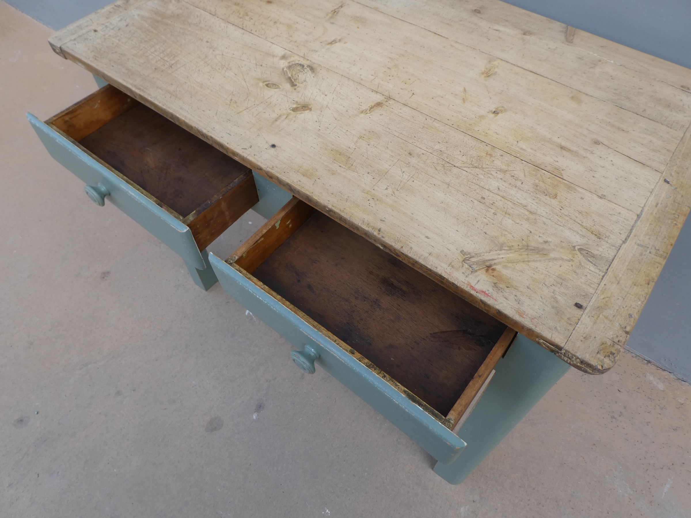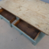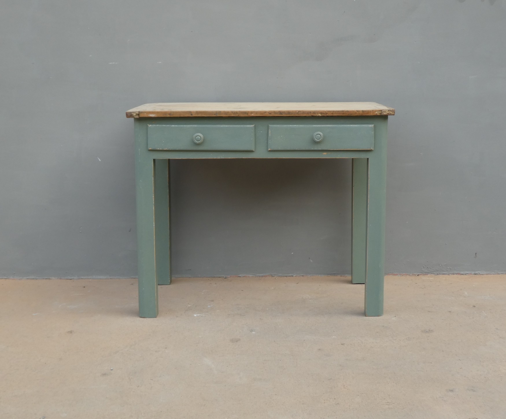 Tavolo tavolino scrittoio rettangolare fisso dotato di due cassetti frontali, laccato e rifinito con la tecnica “Shabby Chic”. Ciò che rende originale questo mobile è il contrasto creato dalla lacca colorata utilizzata per il cavalletto delle gambe, con il piano in pioppo, lasciato a legno. Necessita di alcuni interventi di restauro, sono presenti fori di tarlo (foto). Epoca metà ‘900.