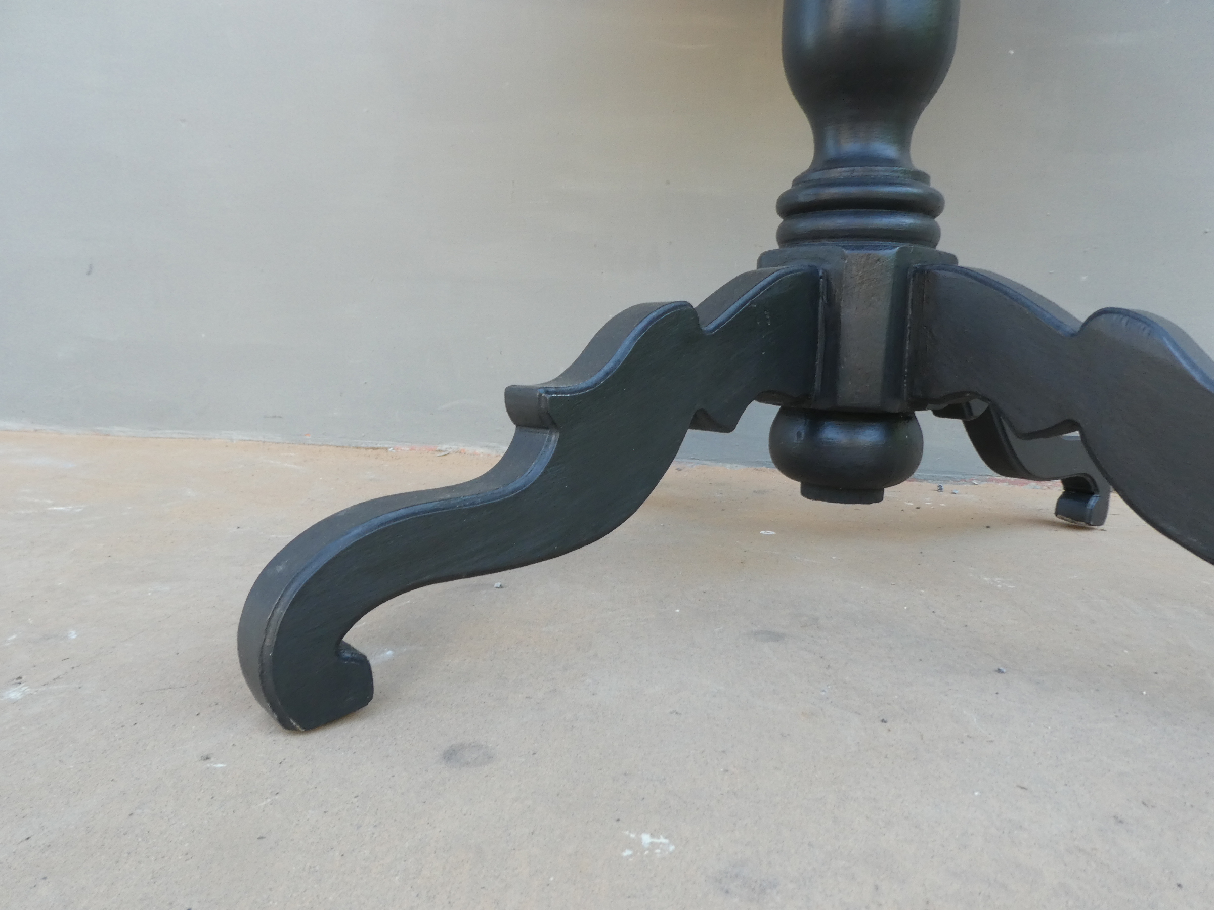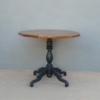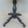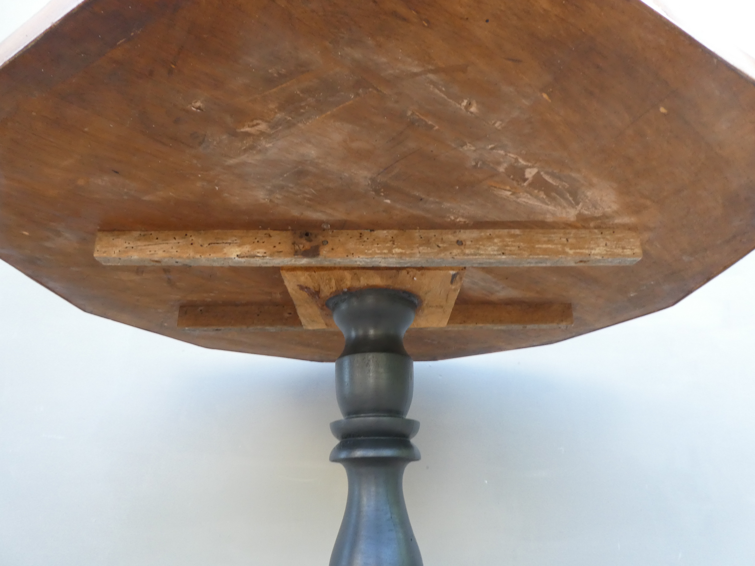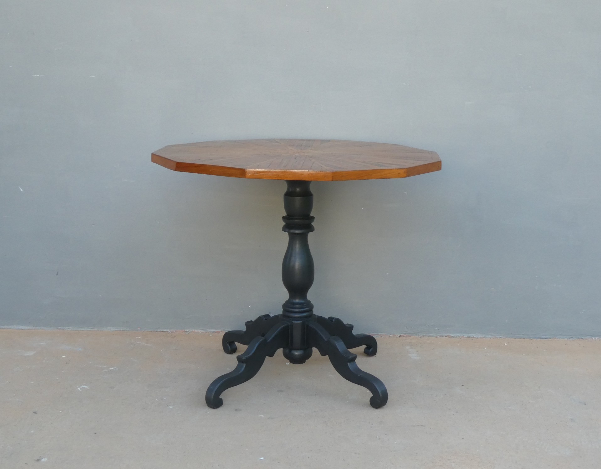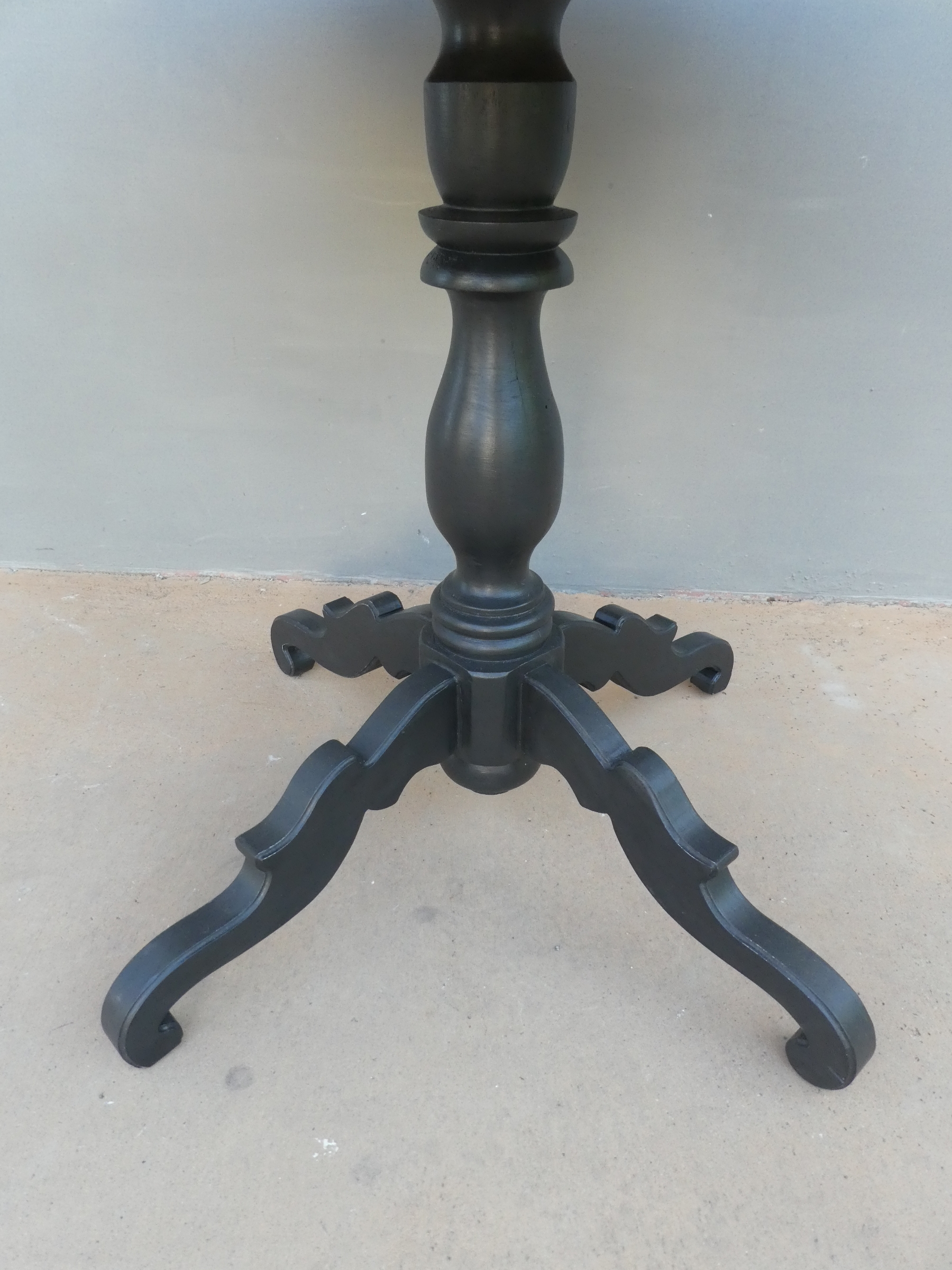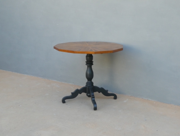 Tavolino tavolo sorretto da un gambo centrale laccato, ramificato su quattro piedi d’appoggio dalla forma armoniosa, ed un piano d’appoggio in legno, impreziosito da intarsi/filetti e dai vari motivi che crea la lastronatura. Necessita di qualche intervento di restauro e sono presenti fori di tarlo sotto il piano. Appartenente d’epoca alla fine dell’ 800 (struttura non originale – assemblata nel tempo).