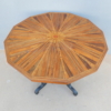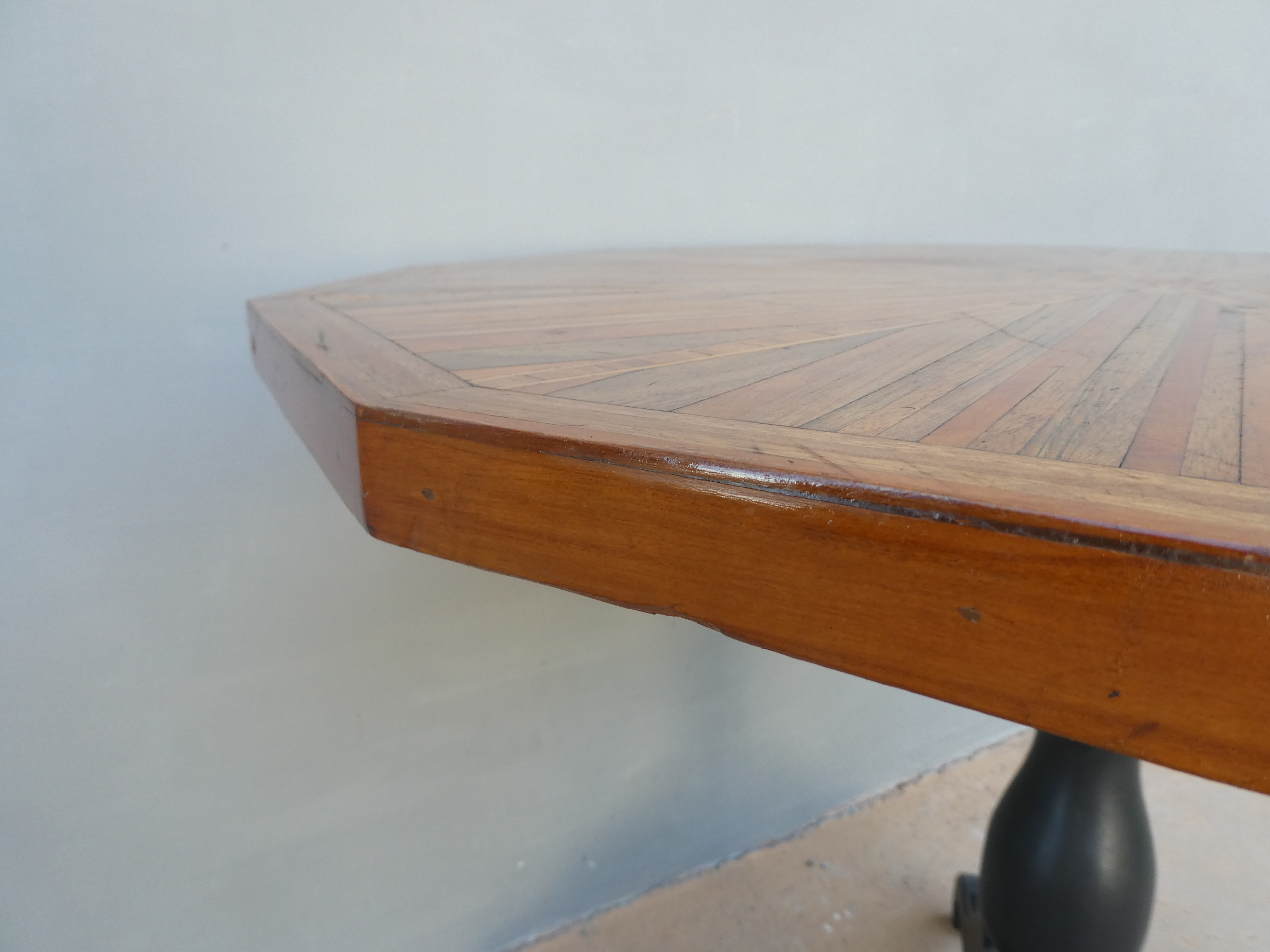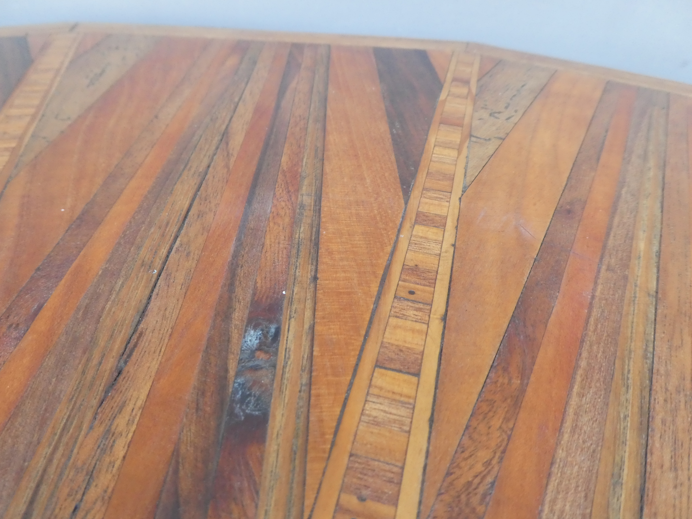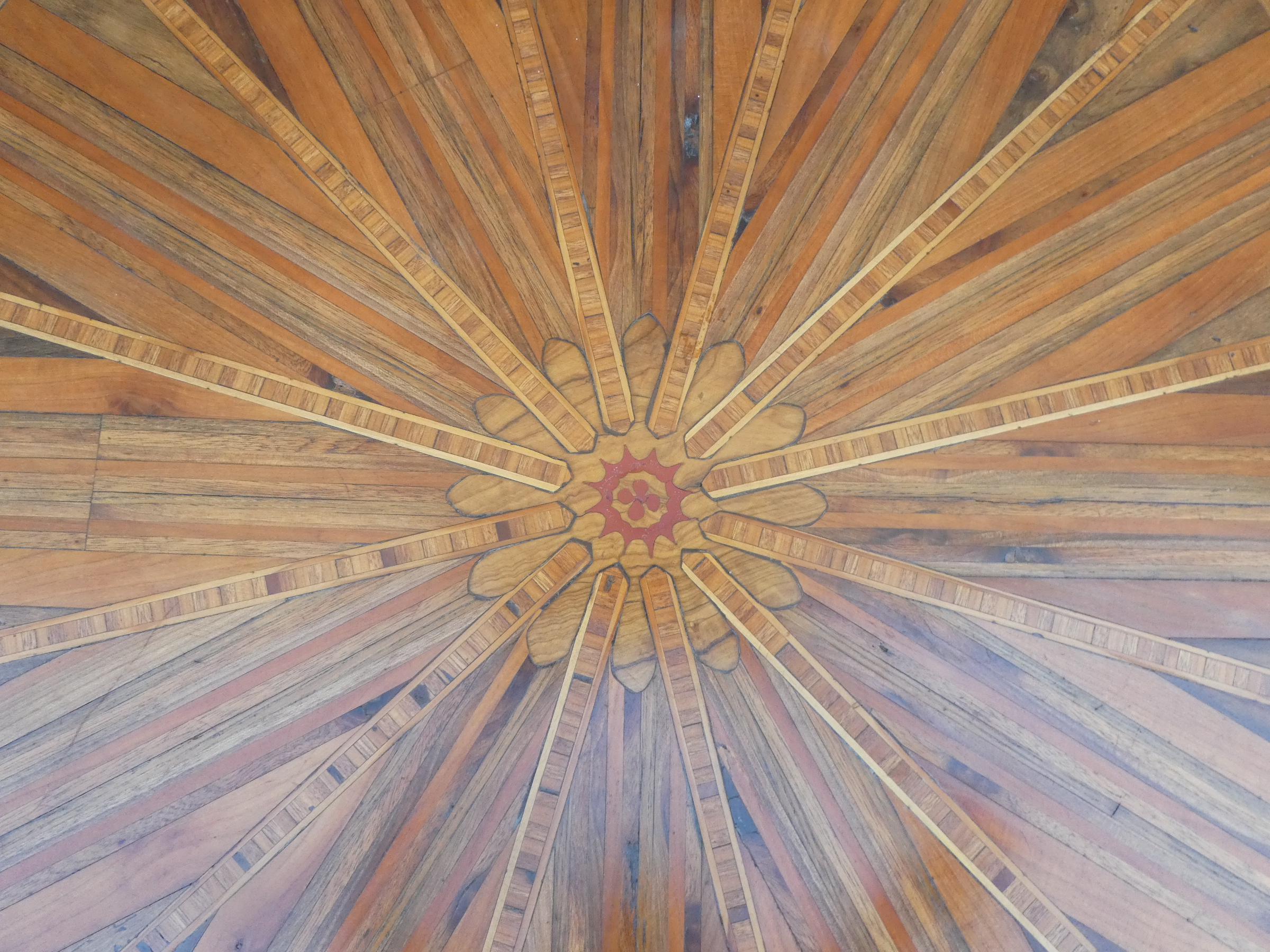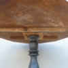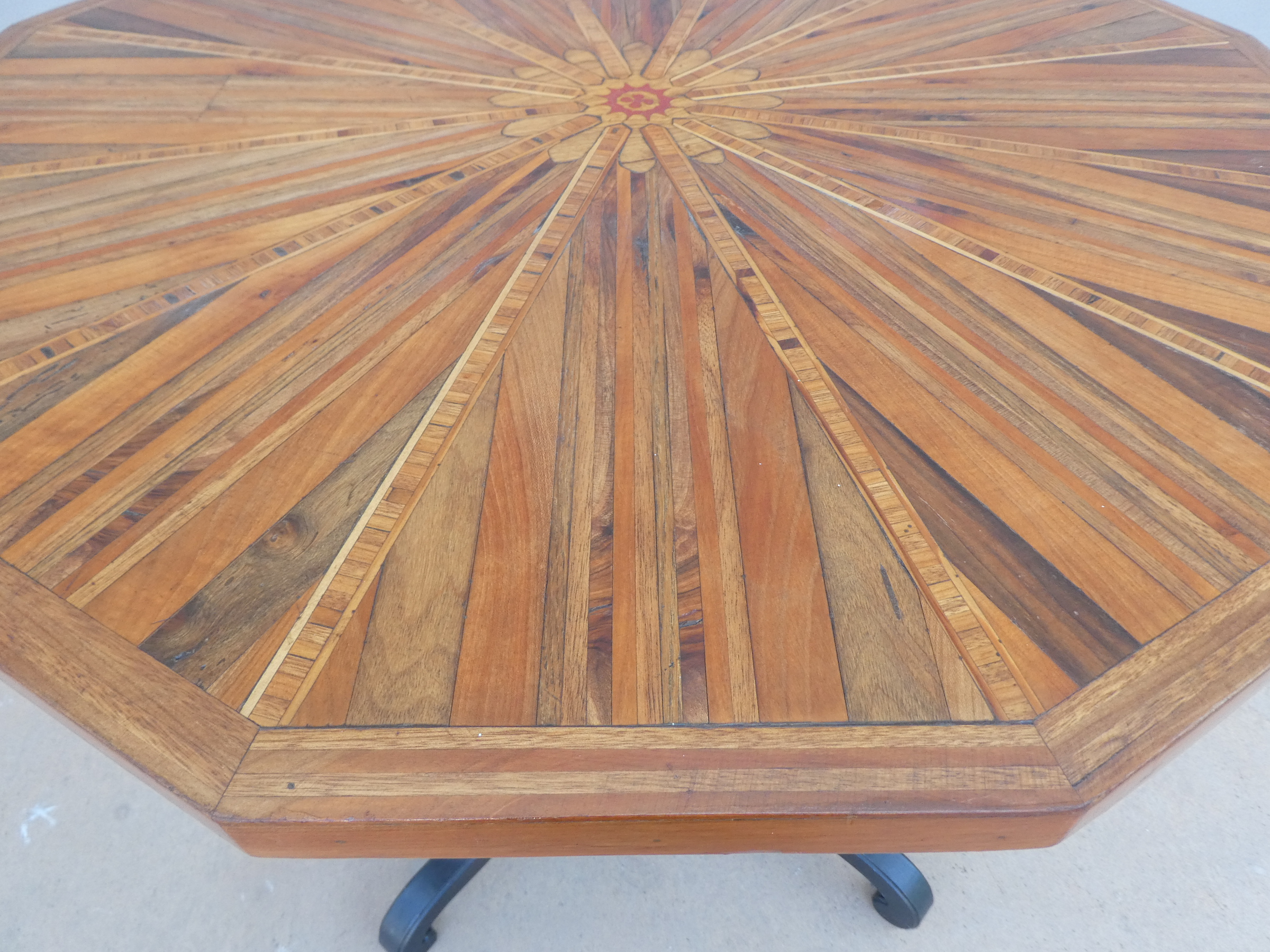 Tavolino tavolo sorretto da un gambo centrale laccato, ramificato su quattro piedi d’appoggio dalla forma armoniosa, ed un piano d’appoggio in legno, impreziosito da intarsi/filetti e dai vari motivi che crea la lastronatura. Necessita di qualche intervento di restauro e sono presenti fori di tarlo sotto il piano. Appartenente d’epoca alla fine dell’ 800 (struttura non originale – assemblata nel tempo).