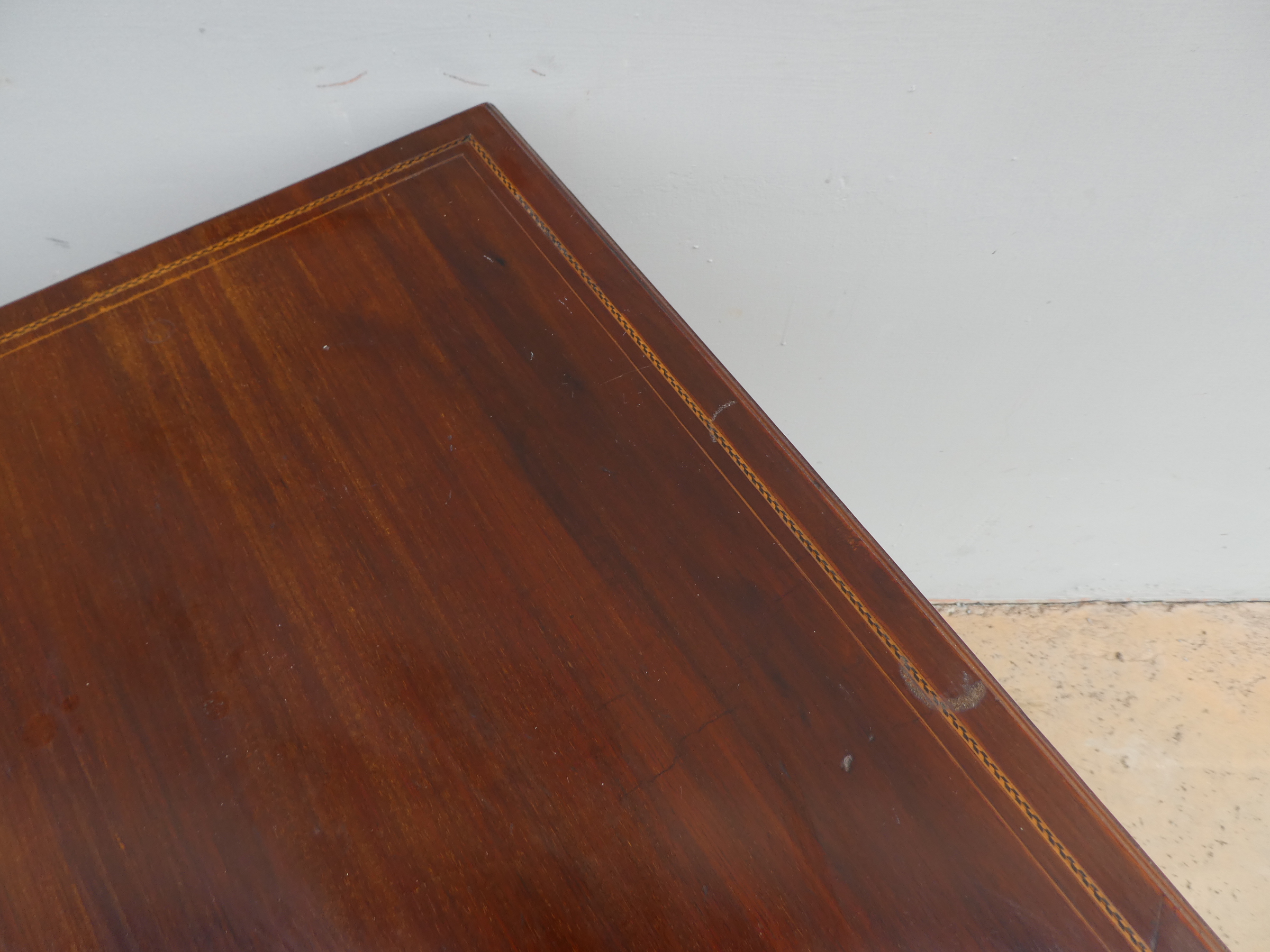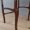 Tris di tavolini rettangolari a ‘cicogna’ realizzati in mogano ed appartenente d’epoca alla prima metà del ‘900. La struttura, impreziosita da un leggero filetto, si presenta semplice ed essenziale. Ciò che la contraddistingue è la sua stessa funzionalità data dal meccanismo ad ‘incastro’, che permette – all’occorrenza – di ottenere tre tavolini singoli. Necessitano di leggeri interventi di restauro – i tavolini possono essere usati anche separatamente.