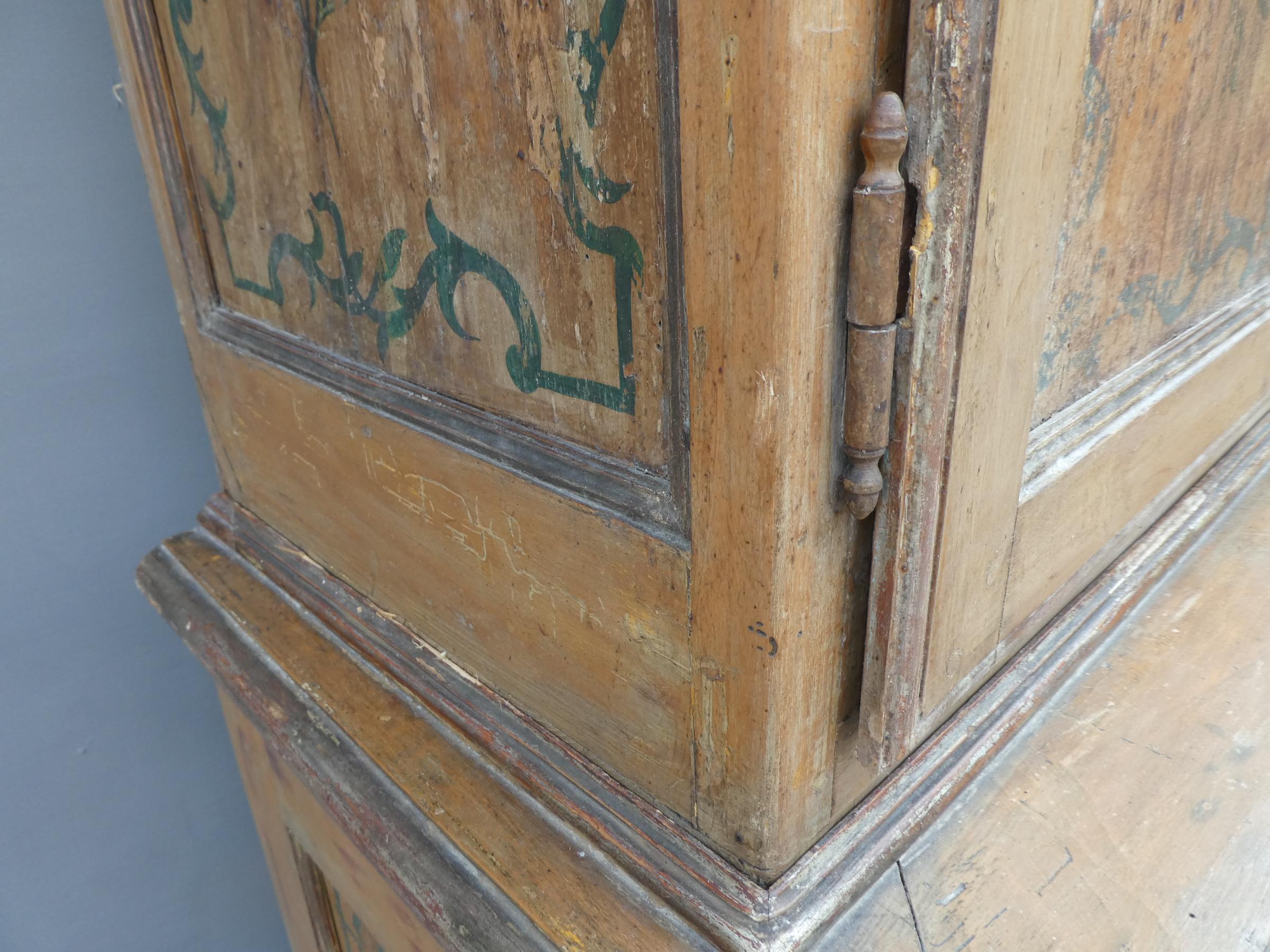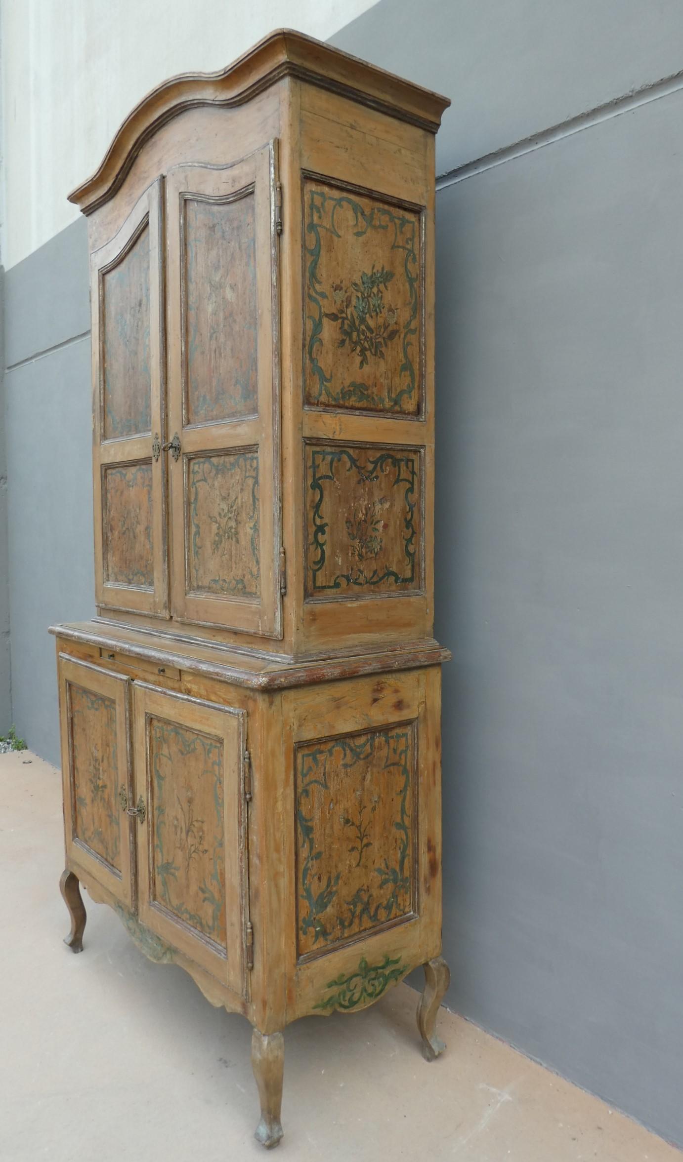 Credenza trumeau doppio corpo con alzata corredata da quattro ante in totale ed una piccola asse a sfilo centrale. La struttura, oltre a vantare proporzioni sapientemente equilibrate, si contraddistingue per i delicati dipinti, che spiccano contrastanti sulla raffinata superficie laccata che fa da sfondo. Necessita di alcuni interventi di restauro (foto). Divisibile in due corpi. Epoca ‘800.